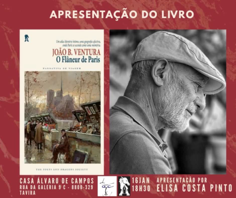 Na sexta-feira, 16 de janeiro, pelas 18:30, tem lugar a apresentação do livro O Flâneur de Paris – Narrativas de Viagem, de João B. Ventura, numa sessão conduzida por Elisa Costa Pinto. A iniciativa decorre na Casa Álvaro de Campos, espaço que tem vindo a afirmar-se como ponto de encontro da criação literária.