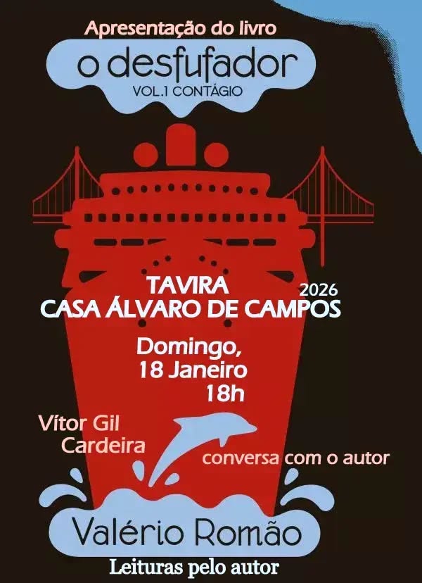A programação prossegue no domingo, 18 de janeiro, pelas 18:00, com a apresentação do livro O Desfufador – Vol. I: Contágio, de Valério Romão, novamente na Casa Álvaro de Campos. O autor estará à conversa com Vítor Gil Cardeira, num encontro que inclui leituras e diálogo com o público.