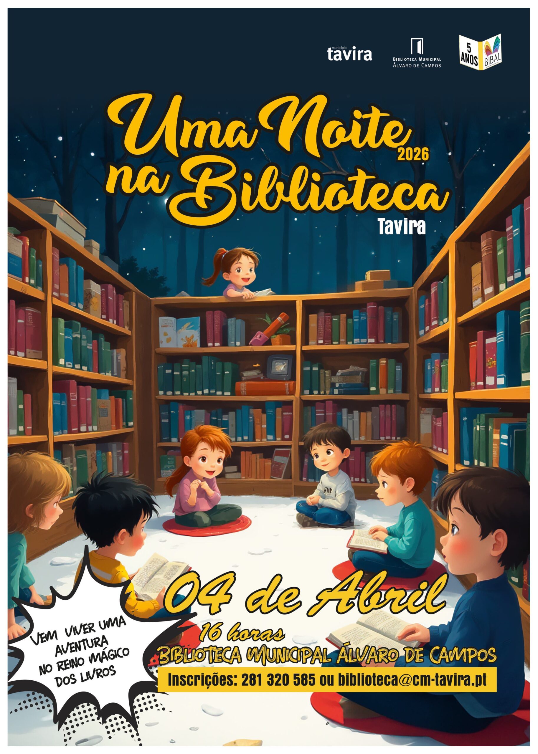 A Biblioteca Municipal Álvaro de Campos, em Tavira, promove no dia 4 de abril, a partir das 16:00, a iniciativa “Uma Noite na Biblioteca”, integrada nas comemorações do Dia Internacional do Livro Infantil e no projeto “Até à Lua”.