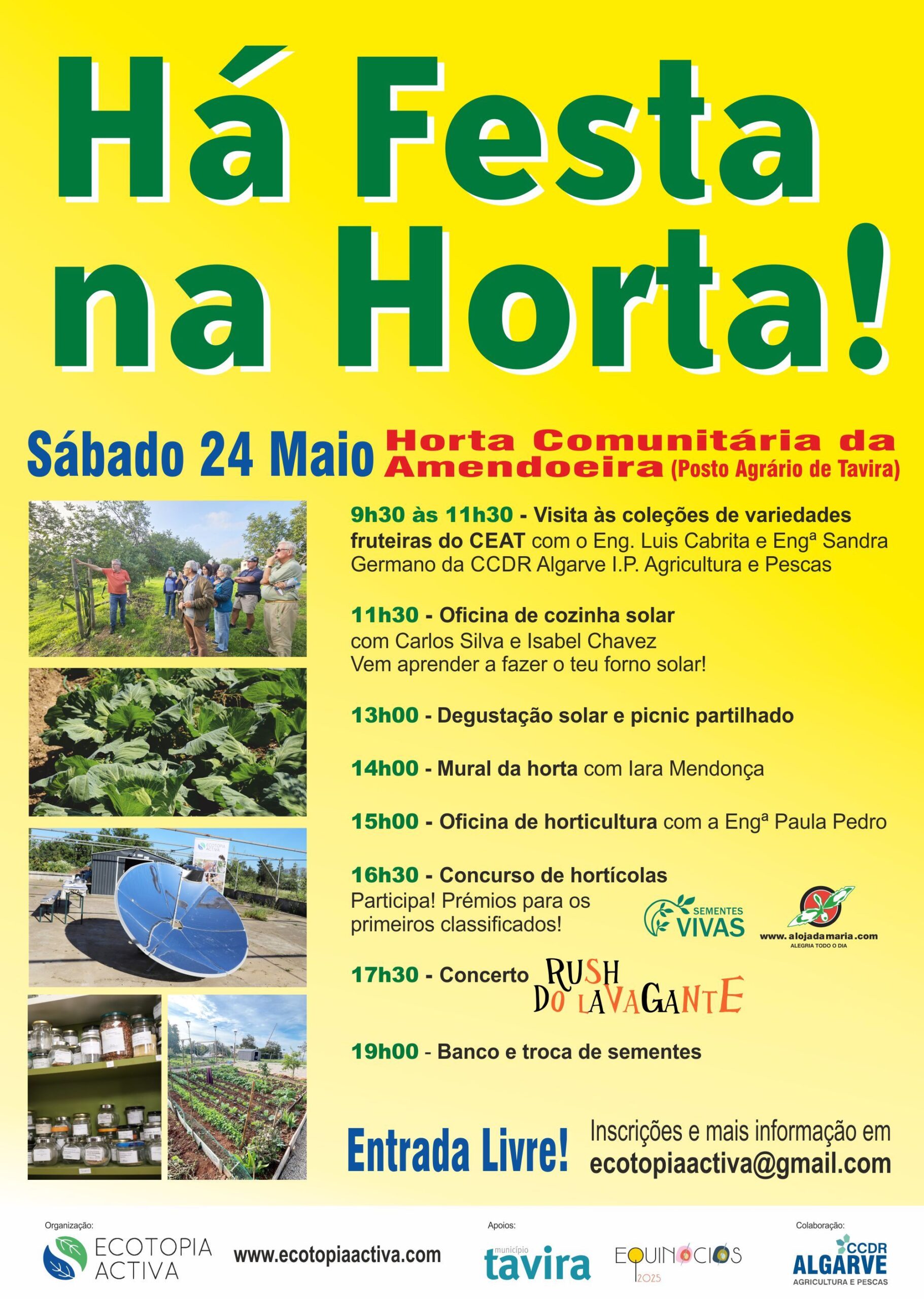 A associação Ecotopia Activa, de Tavira, vai organizar no próximo dia 24 de maio, entre as 09:30 e as 19:30, o evento “Há Festa na Horta!” – da horta ao prato para uma vida saudável!, integrado no programa municipal Equinócios, promovido pela Câmara Municipal de Tavira. A iniciativa terá lugar na Horta Comunitária da Amendoeira, no Posto Agrário de Tavira, e a entrada é livre.