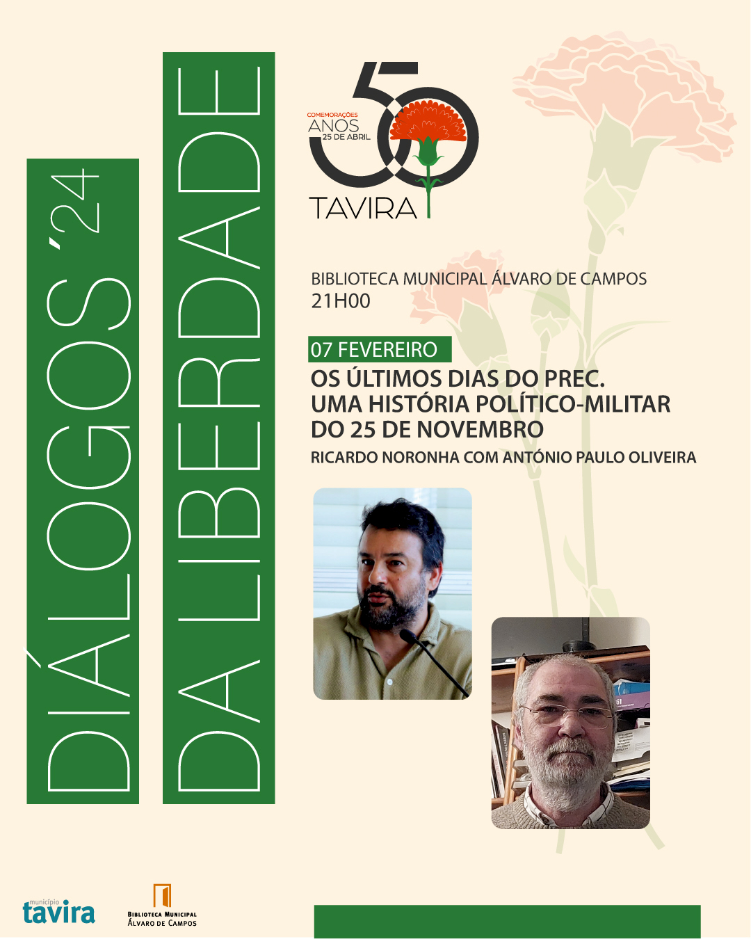 O ciclo “Diálogos da Liberdade” regressa no próximo dia 7 de fevereiro à Biblioteca Municipal Álvaro de Campos, em Tavira, encerrando um programa de dois anos integrado nas comemorações dos 50 anos da Revolução de Abril, com debates dedicados à história, à democracia e à cidadania.