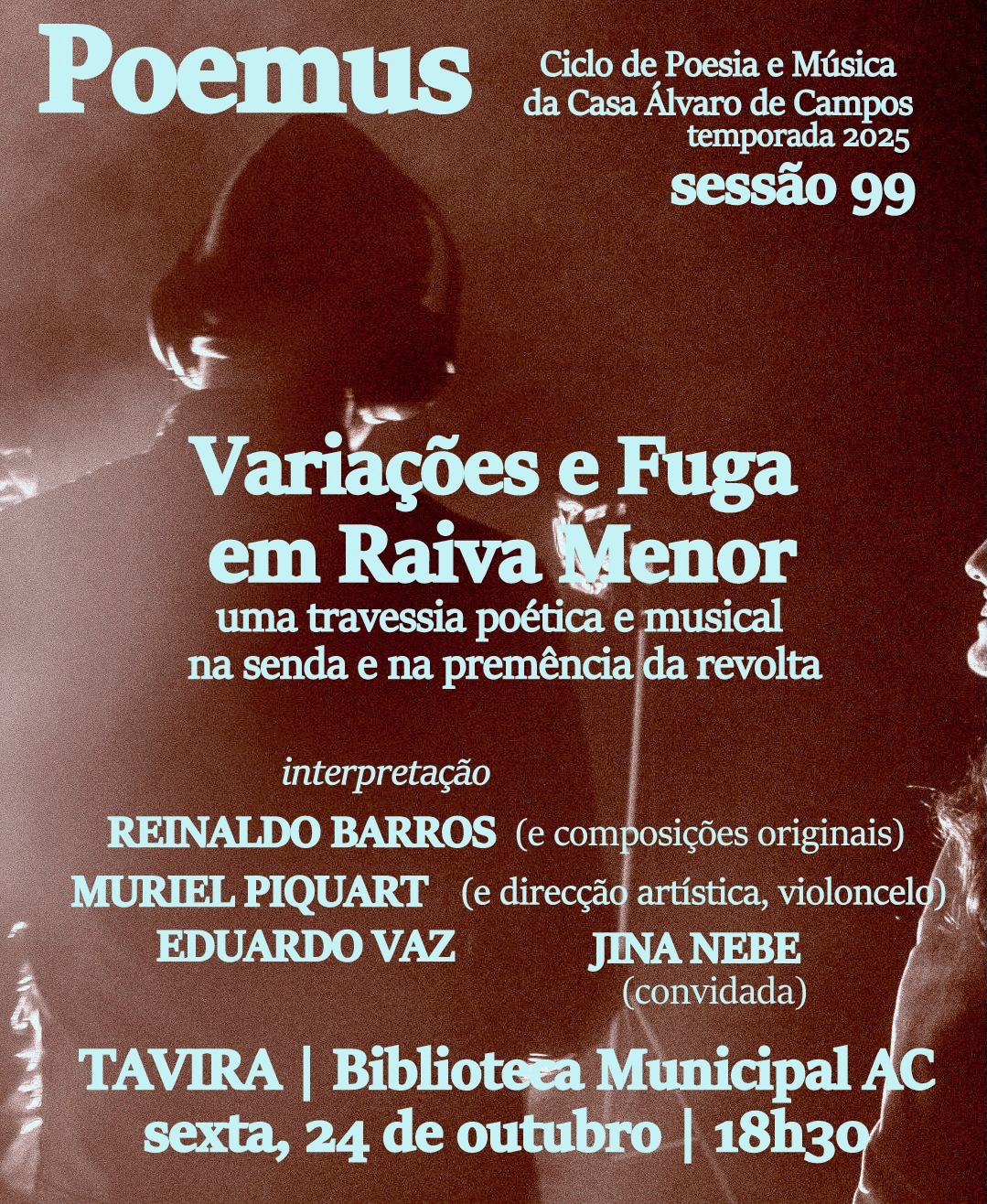 O espetáculo intitulado “Variações e Fuga em Raiva Menor” propõe uma travessia poética e musical “na senda e na premência da revolta”, unindo palavra e som num percurso entre a emoção e a reflexão.
