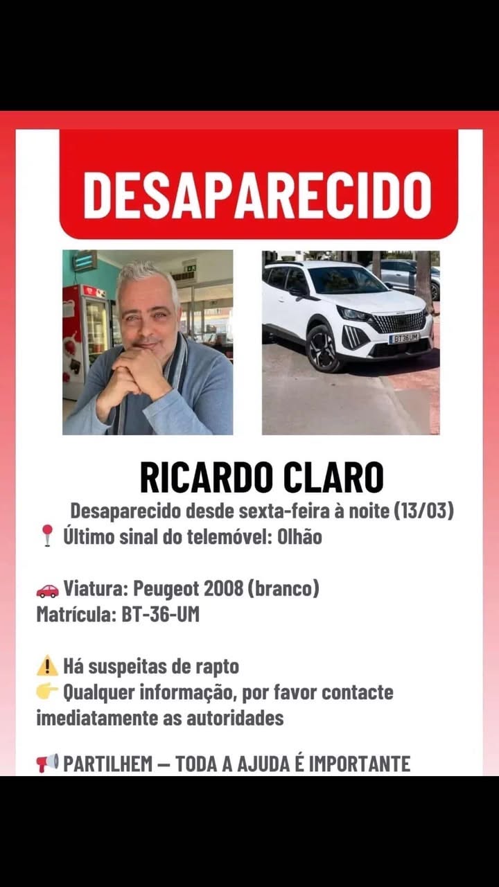 As autoridades prosseguem a investigação, procurando apurar as circunstâncias do desaparecimento e localizar Ricardo Claro.