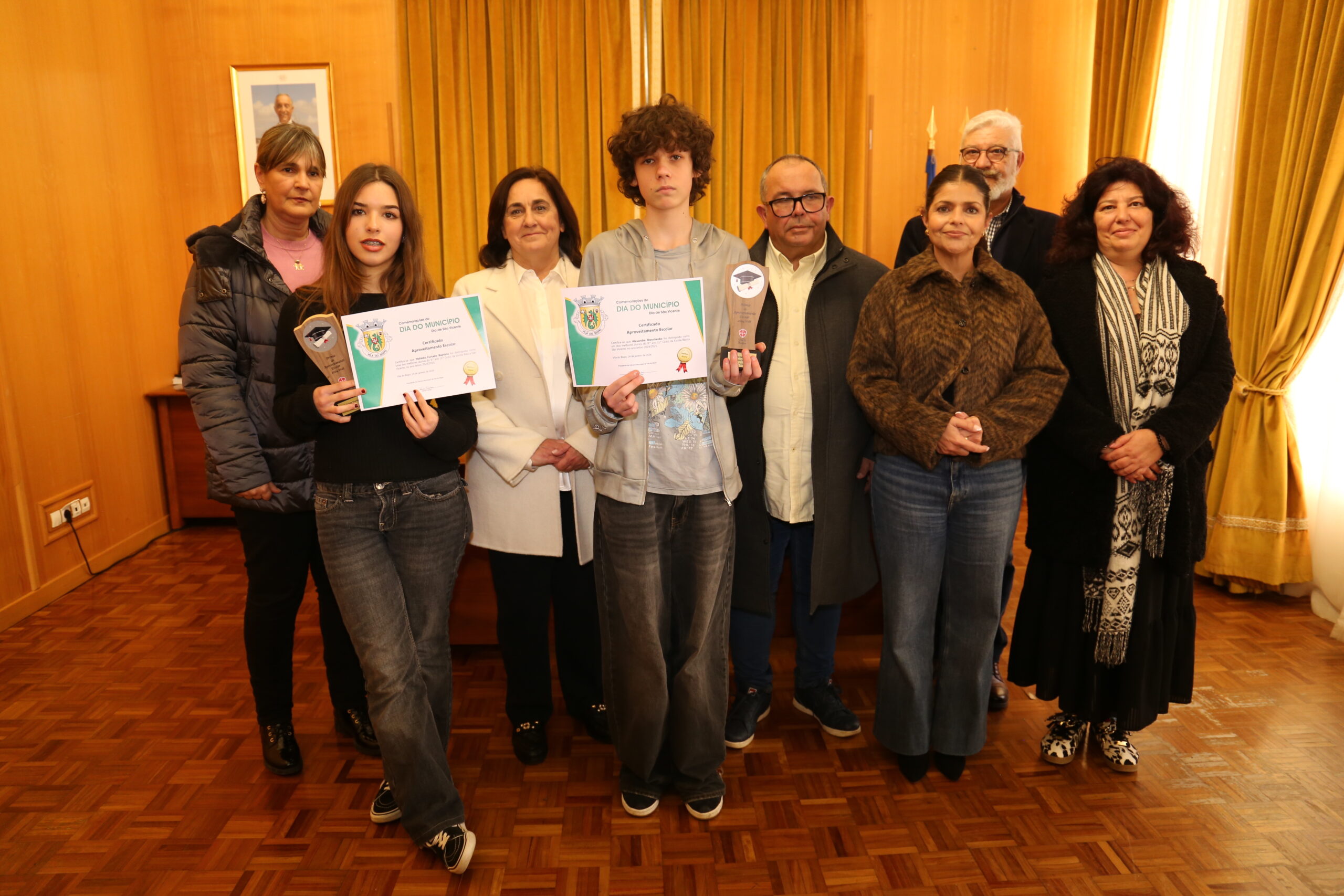 A sessão decorreu no salão nobre da Câmara Municipal e contou com a presença da presidente da Câmara, Paula Freitas, do presidente da Assembleia Municipal, José Marques, dos vereadores Luís Paixão, Rute Silva e Dora Guerreiro, e da diretora do Agrupamento de Escolas do concelho, Carla Cunha, que procederam à entrega dos prémios.
