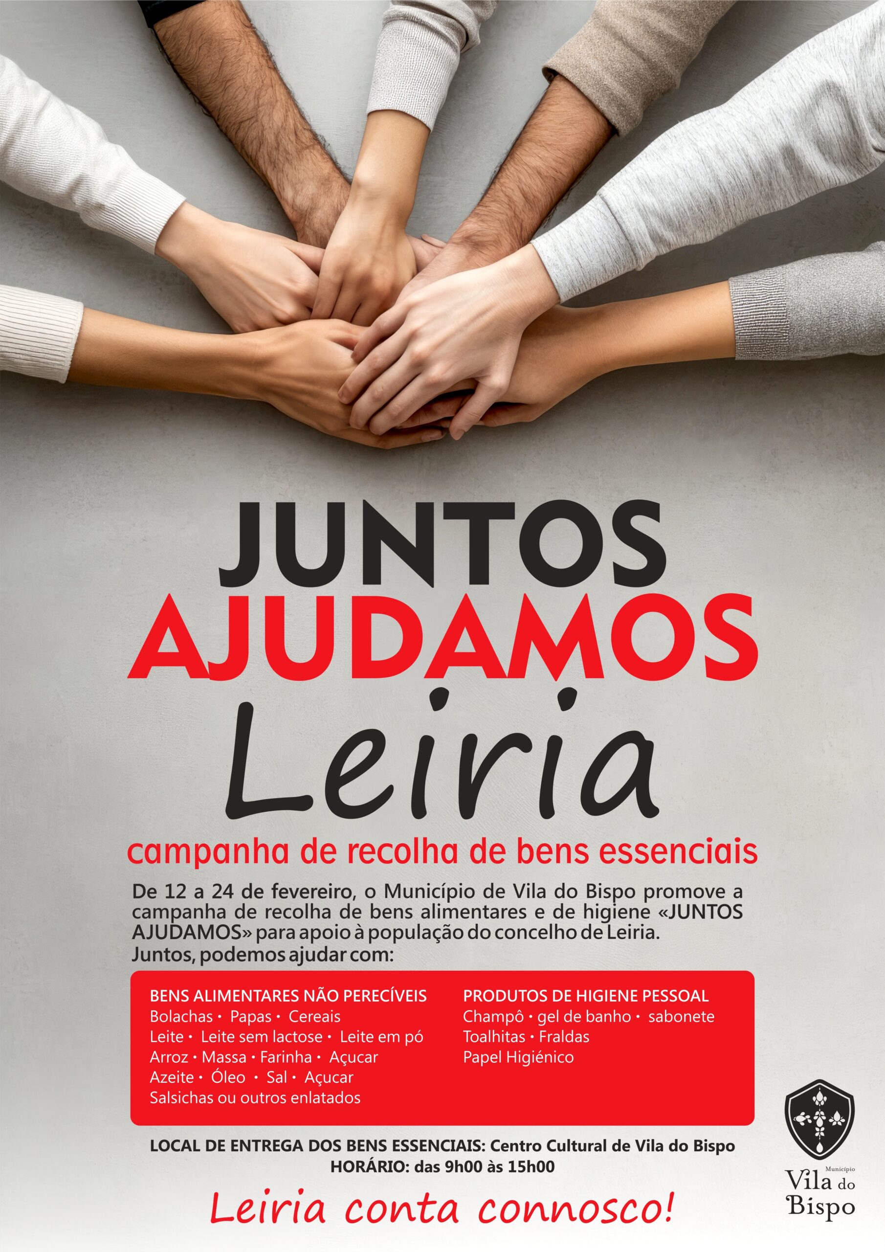 O Município de Vila do Bispo está a dinamizar, até 24 de fevereiro, a campanha de recolha de bens alimentares e produtos de higiene “Juntos Ajudamos”, com o objetivo de apoiar a população do concelho de Leiria.