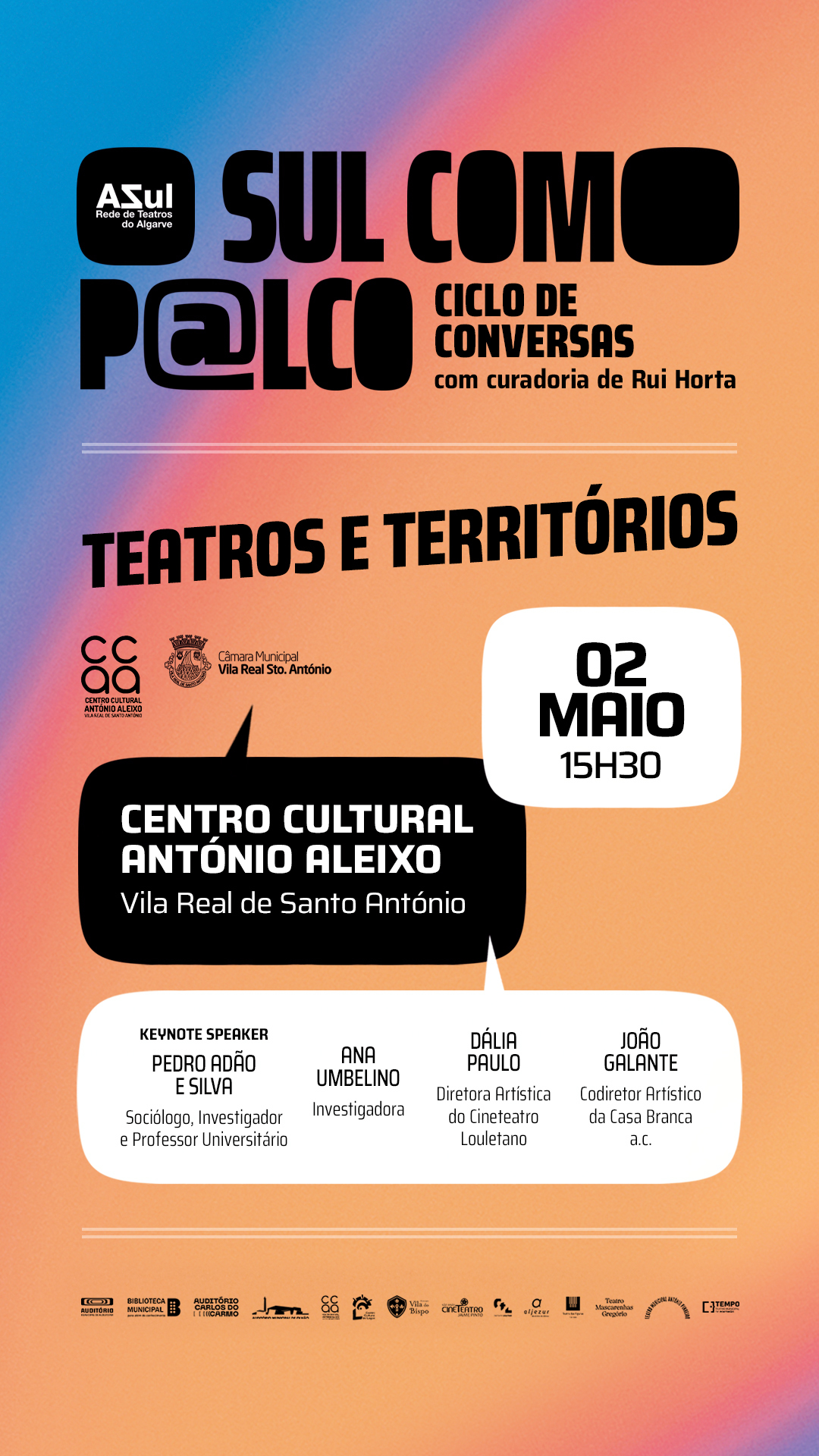 O calendário do ciclo inicia-se a 2 de maio, em Vila Real de Santo António, com o tema “Teatros e Territórios”. Segue-se, a 9 de maio, em São Brás de Alportel, a sessão “Públicos em movimento: Quem vem ao teatro – e quem ainda não vem”.