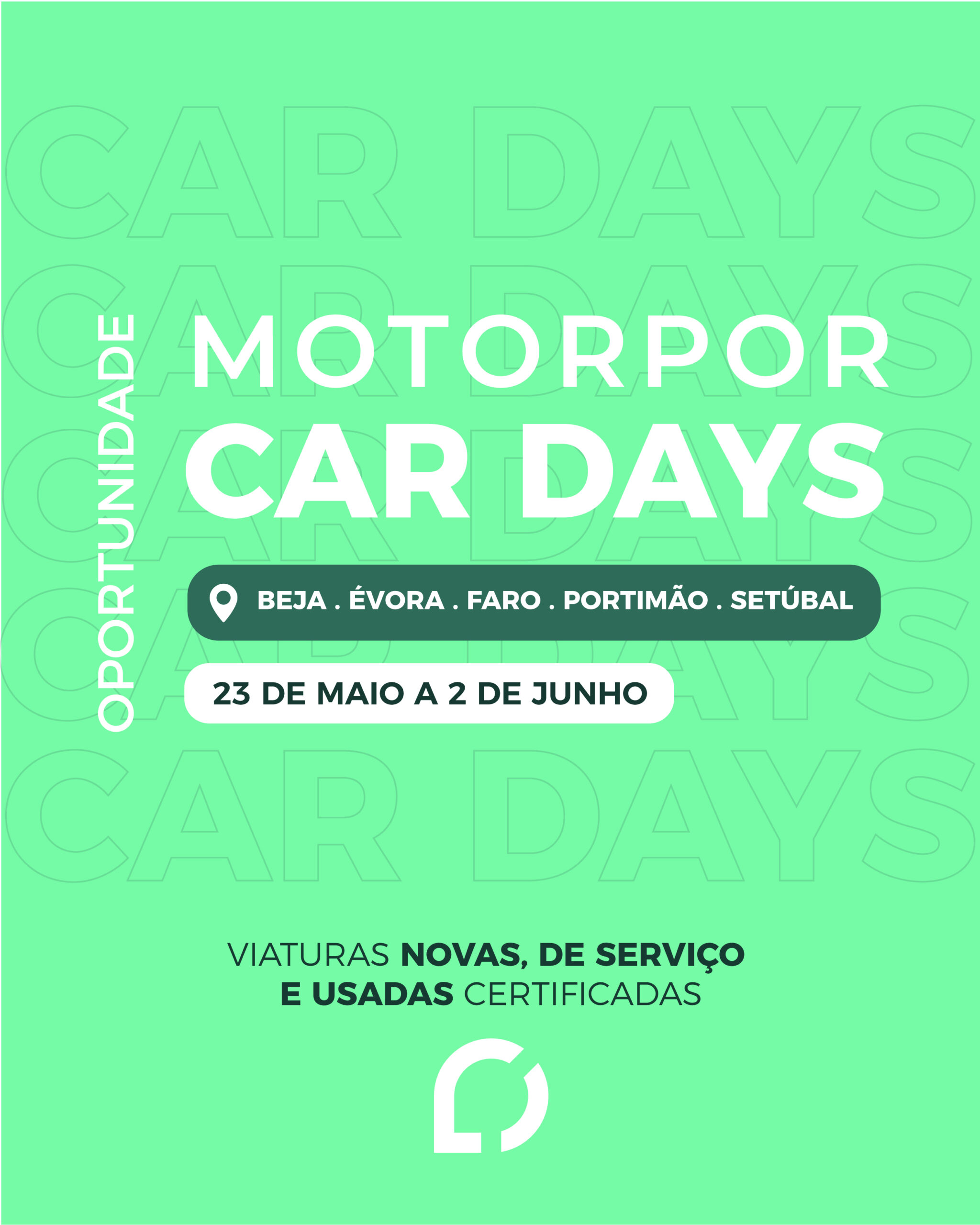 De 23 de maio a 2 de junho de 2025, a Motorpor promove a 5.ª edição dos Motorpor Car Days, com uma vasta seleção de viaturas novas, usadas e de serviço.