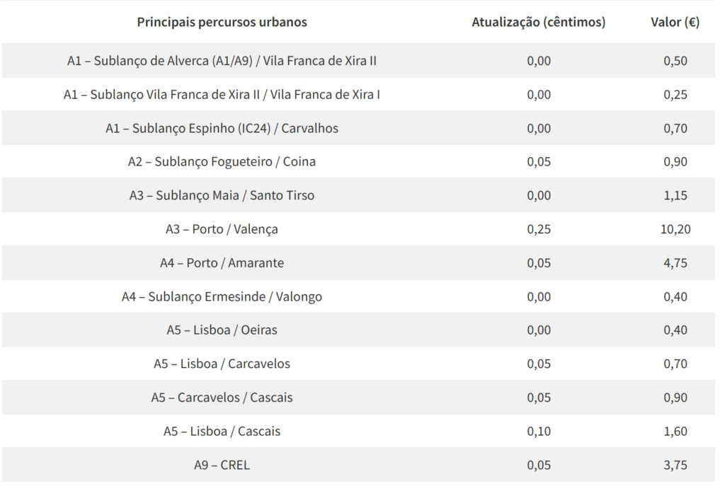 Confira a lista dos troços que tiveram subida de preços: