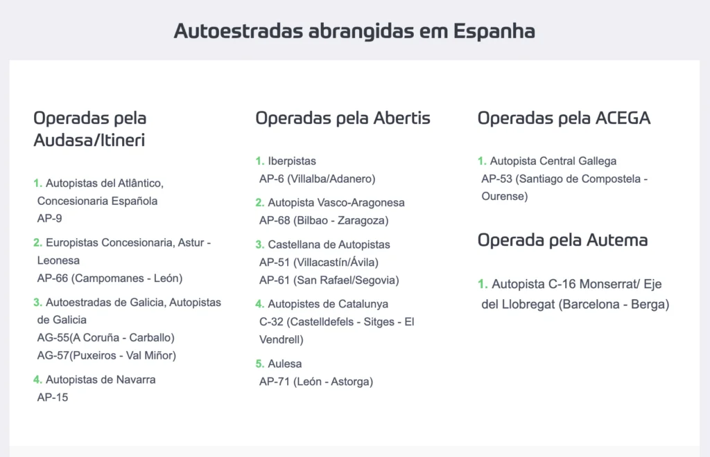 Conforme a mesma fonte, a lista inclui, entre outras, a AP‑9 (Ferrol–Pontevedra–Vigo–fronteira), AP‑53 (Santiago–Orense), AP‑66 (Campomanes–Leão), C‑32 (Castelldefels–Sitges) e C‑16 (Monserrate–Barcelona). Mais adiante revelaremos os detalhes completos.