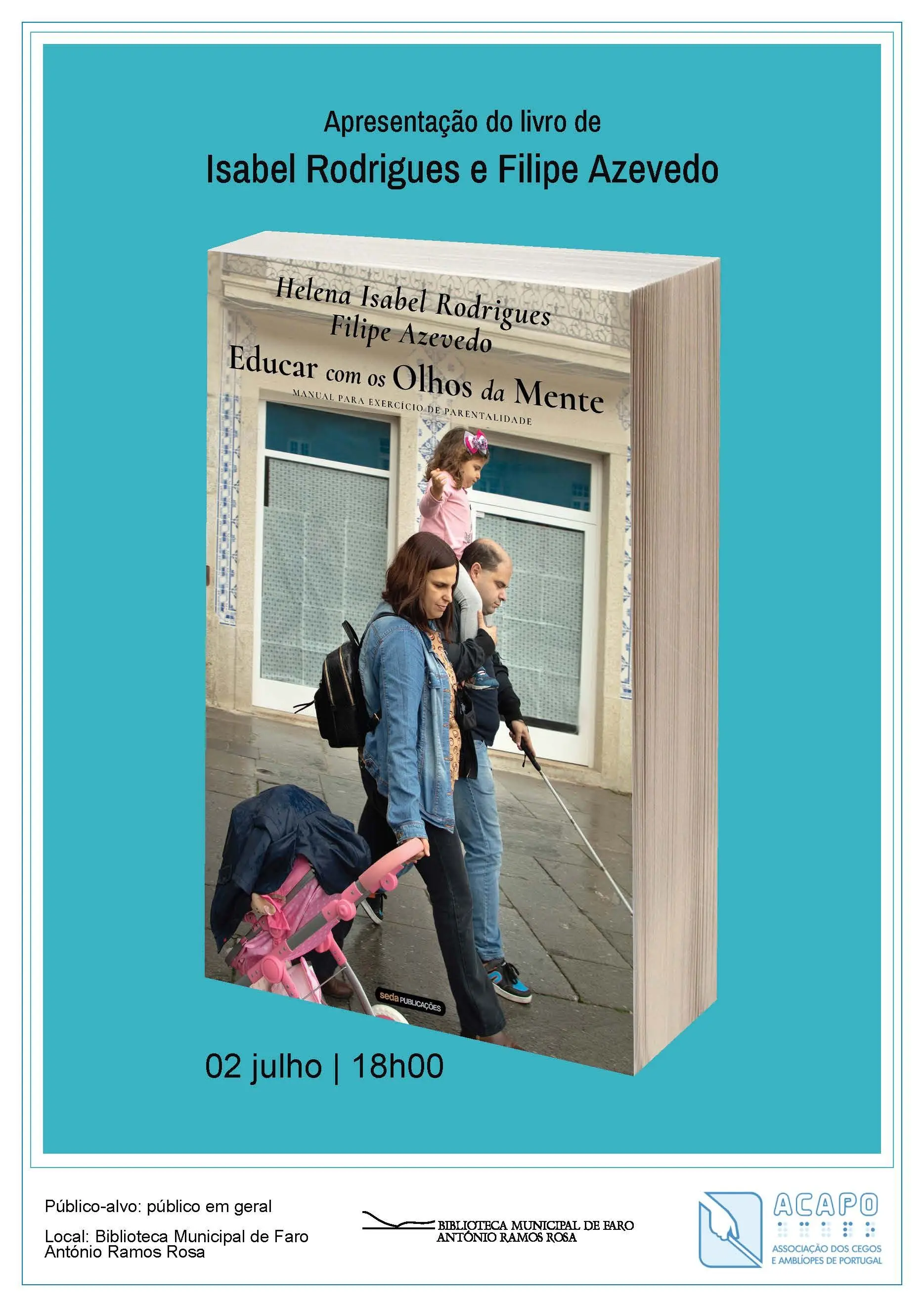 A Delegação do Algarve da ACAPO, em parceria com a Biblioteca Municipal António Ramos Rosa em Faro, promove no dia 2 de julho pelas 18:00, a apresentação do livro “Educar com os Olhos da Mente”, da autoria de Helena Isabel Rodrigues e Filipe Azevedo.