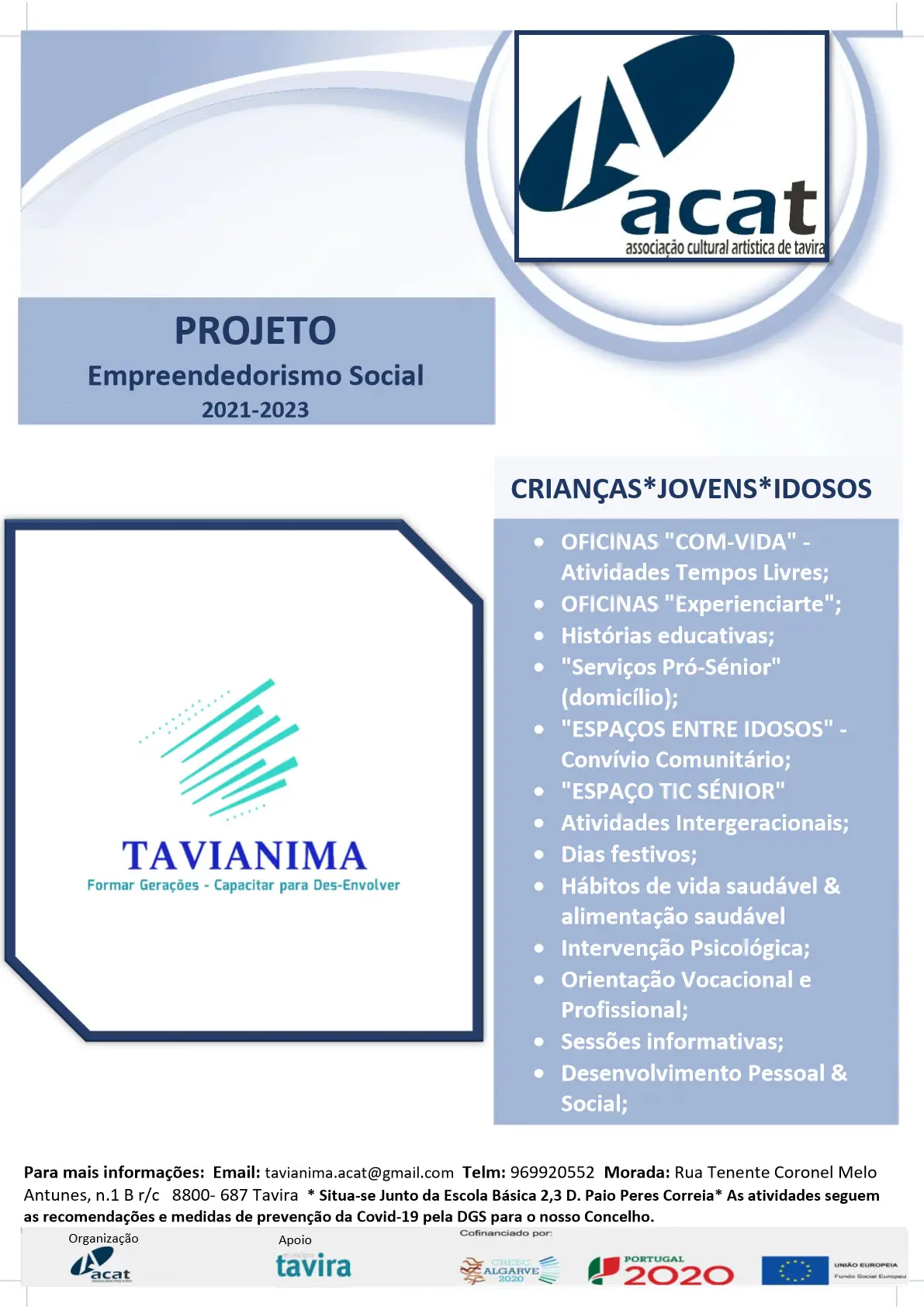 A Associação Cultural Artística de Tavira (ACAT), membro do Conselho Local de Ação Social (CLAS) de Tavira, encontra-se a promover o projeto “TAVIANIMA: Formar Gerações – Capacitar para Des-Envolver”, o qual preconiza a dinamização de um conjunto integrado de ações em diferentes eixos de intervenção na área social, nomeadamente com crianças, jovens e idosos.