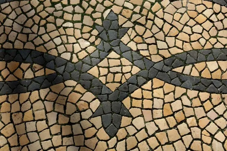 A calçada portuguesa resulta do calcetamento com pedras de formato irregular, geralmente em calcário branco e negro, que podem ser usadas para formar padrões decorativos ou mosaicos pelo contraste entre as pedras de distintas cores.
