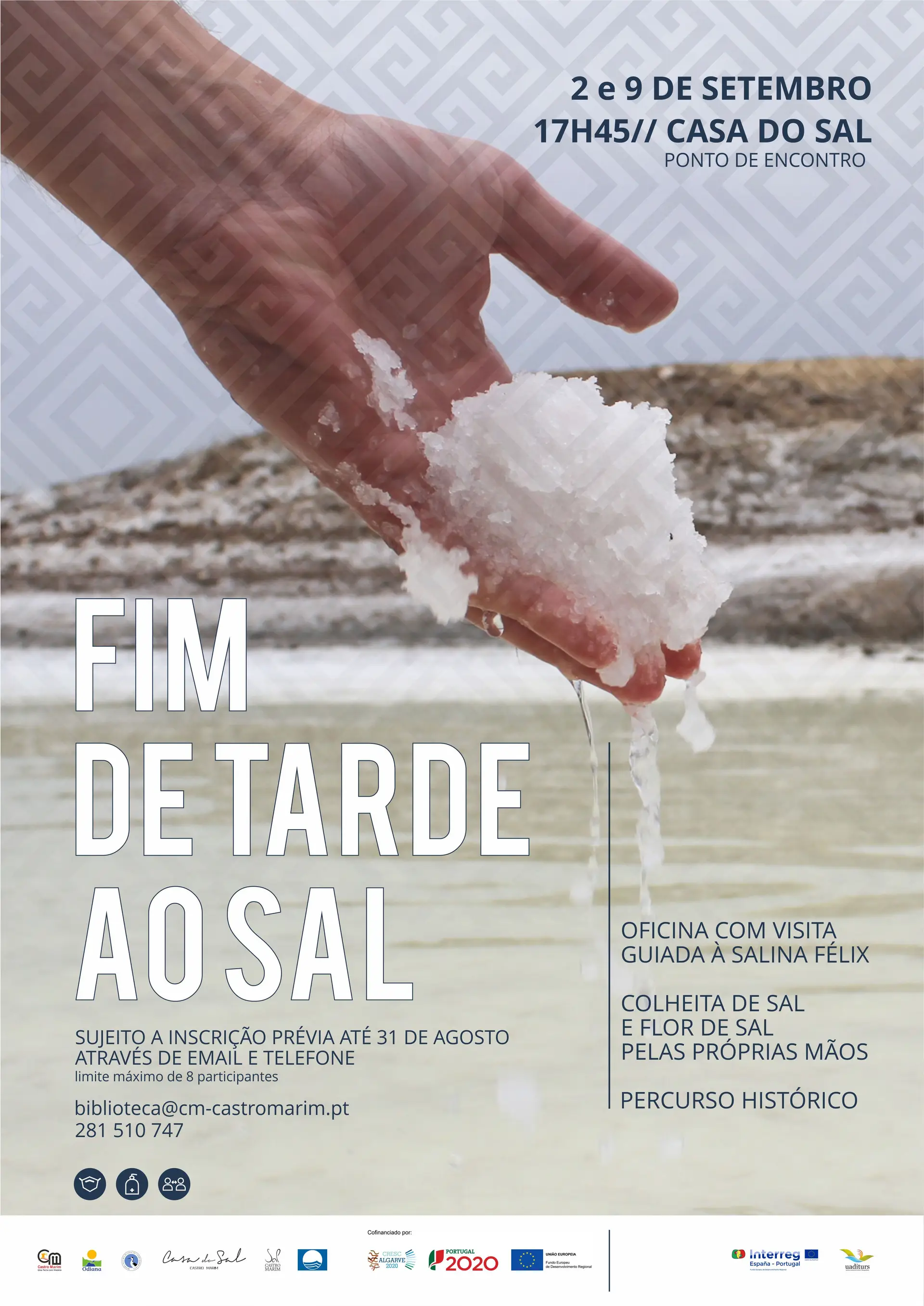 O “Fim de Tarde ao Sal” é uma ação organizada pelo Município de Castro Marim e Associação Odiana, integrada no programa Bandeira Azul 2020 e enquadrada na dacandidatura “Patrimónios de Castro Marim: Valorização e Promoção de Produtores Locais e Produtos Endógenos”, comparticipada pelo PO CRESC 2020, projeto PADRE, apoiada por Portugal e União Europeia, cofinanciada a 70% pelo FEDER.