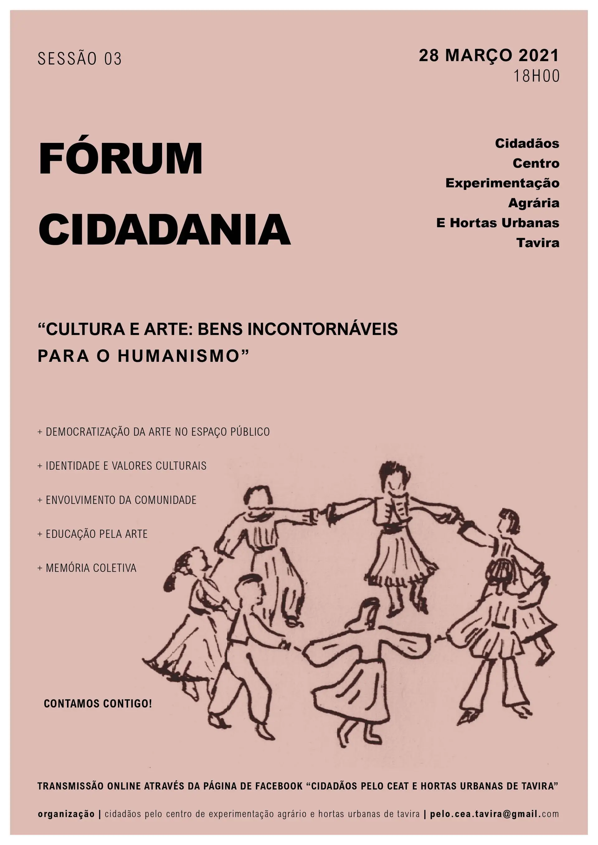 A terceira sessão do Fórum Cidadania, subordinada ao tema “Cultura e Arte: Bens incontornáveis para o Humanismo”, vai realizar-se este domingo, a partir das 18:00, promovido pelo movimento de Cidadãos pelo Centro de Experimentação Agrária e Hortas Urbanas de Tavira (CEAT).