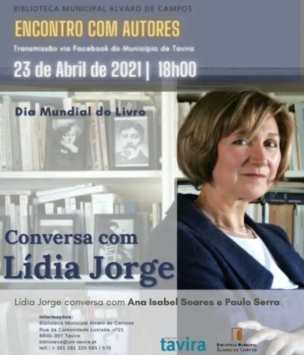 No âmbito do programa Encontro com Autores (online), realiza-se, no dia 23 de abril, pelas 18:00, via Facebook do Município de Tavira, uma conversa com a escritora Lídia Jorge.
