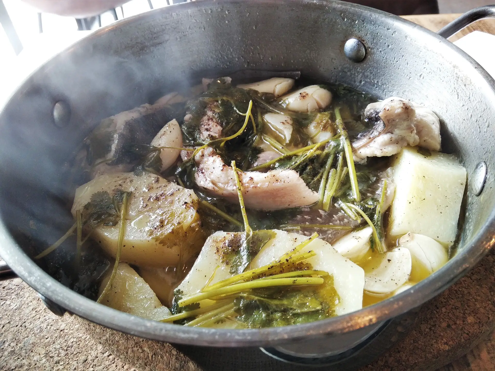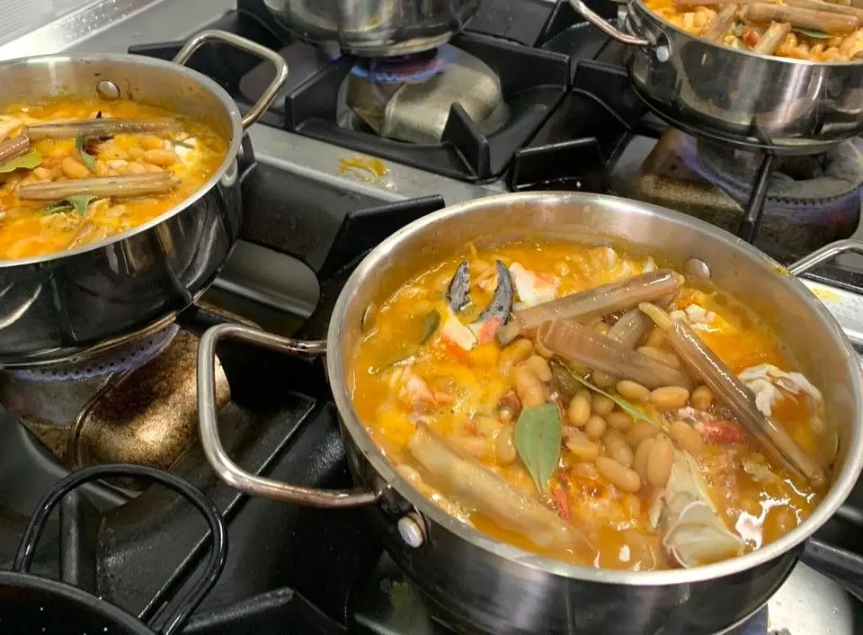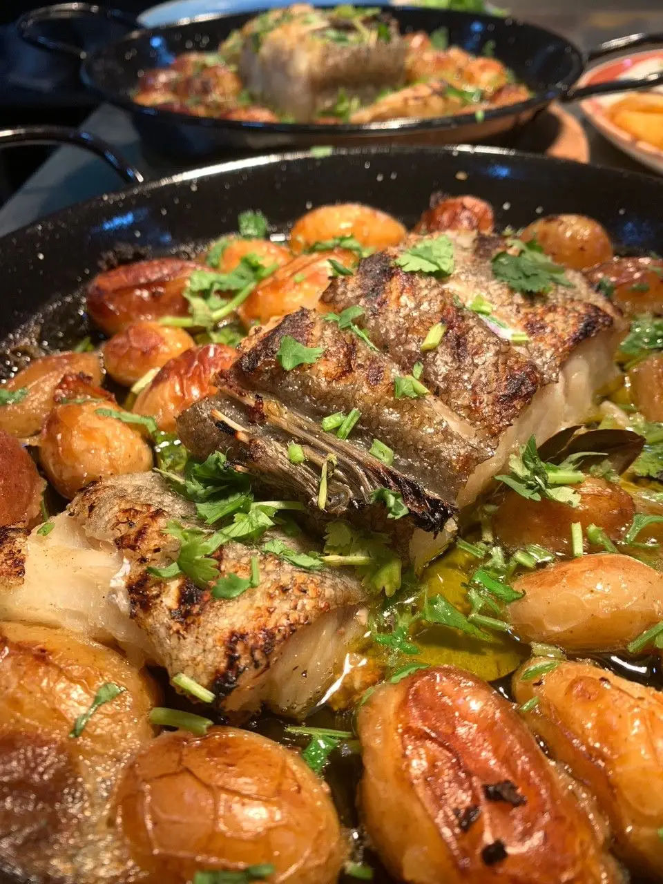 Com o peixe do dia prepara-se uma massinha (€34) competente. No que toca às Especialidades do Avô Vítor, centradas nas confeções de panela, um dos destaques é a fumegante Raia alhada (€15), rica em alho, com a proteína no ponto e de lasca fácil, as batatas, a frescura dos coentros, o azeite de qualidade e, por norma, salicórnia. Se preferir pode escolher o Xarém ou a Carne de Porco com amêijoas, o Polvo ou o Bacalhau à Lagareiro e caldeiradas por encomenda. As lulas, o camarão Tigre e várias espetadas, como a de Tamboril e Camarão (€17), compõem a secção da Grelha do Avô António.