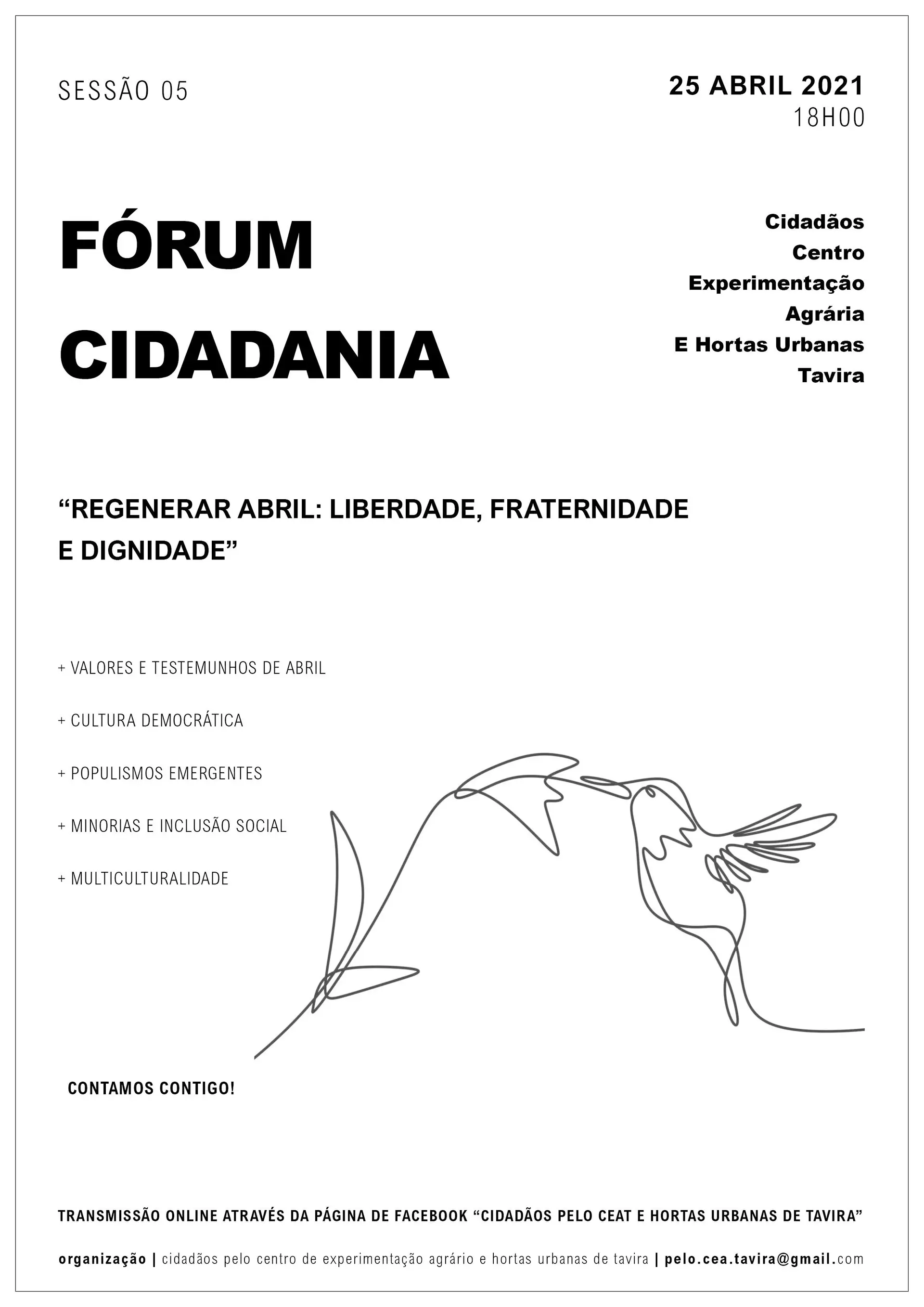 “Regenerar Abril: Liberdade, Fraternidade e Dignidade” é o tema da quinta sessão da iniciativa Fórum Cidadania promovida pelos Cidadãos pelo CEAT e Hortas Urbanas de Tavira.
