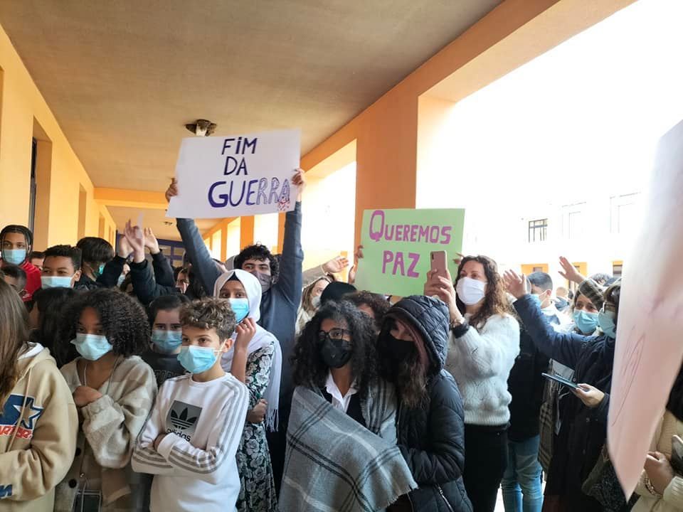 Começou por ser feito um minuto de silêncio em memória das vítimas da guerra. Depois, os alunos leram muitas mensagens de paz, não só em português, mas também em ucraniano, em búlgaro, em espanhol e em inglês, todas elas a apelar à paz e ao fim de todas as guerras.