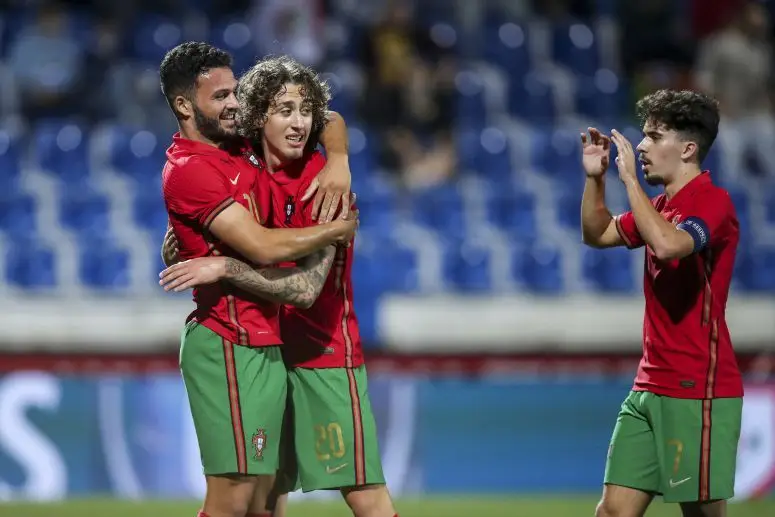 Gonçalo Ramos, com um ‘hat-trick’, aos 6, 53 e 61 minutos, Gonçalo Inácio (21), Fábio Vieira (51) e Henrique Araújo (71) marcaram os golos da ‘equipa das quinas’, que somou o quinto triunfo no Grupo D, numa partida em que Fábio Silva desperdiçou um penálti (29).