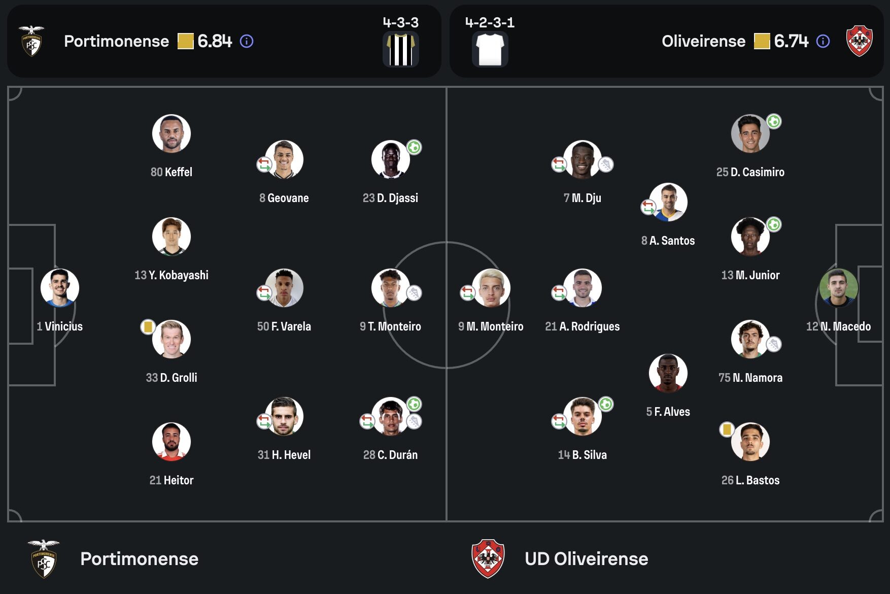 – Portimonense: Vinicius Silvestre, Heitor, Douglas Grolli, Yuki Kobayashi, Keffel, Francisco Varela (Lucas Araújo, 32), Geovane (Diogo Ferreira, 80), Camilo Durán (Juan Alegría, 80), Hector Hevel (Acquah, 71), Danio Djassi e Tamble Monteiro.
