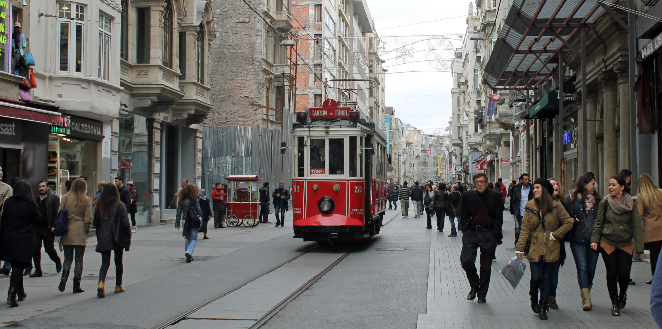 A rua Taksim, pedonal, cheia de comércios fascinantes, pastelarias sofisticadas e quiosques vendendo tabletes de chocolates artesanais, termina na grande praça homónima, onde o eléctrico faz um percurso circular para regressar ao início. É aqui que encontramos os pequenos estabelecimentos onde empregados de aventais brancos, engomados e imaculados mesmo após uma jornada longa de trabalho, preparam os irresistíveis kebab que acompanham com sumos de toranja ou romã.