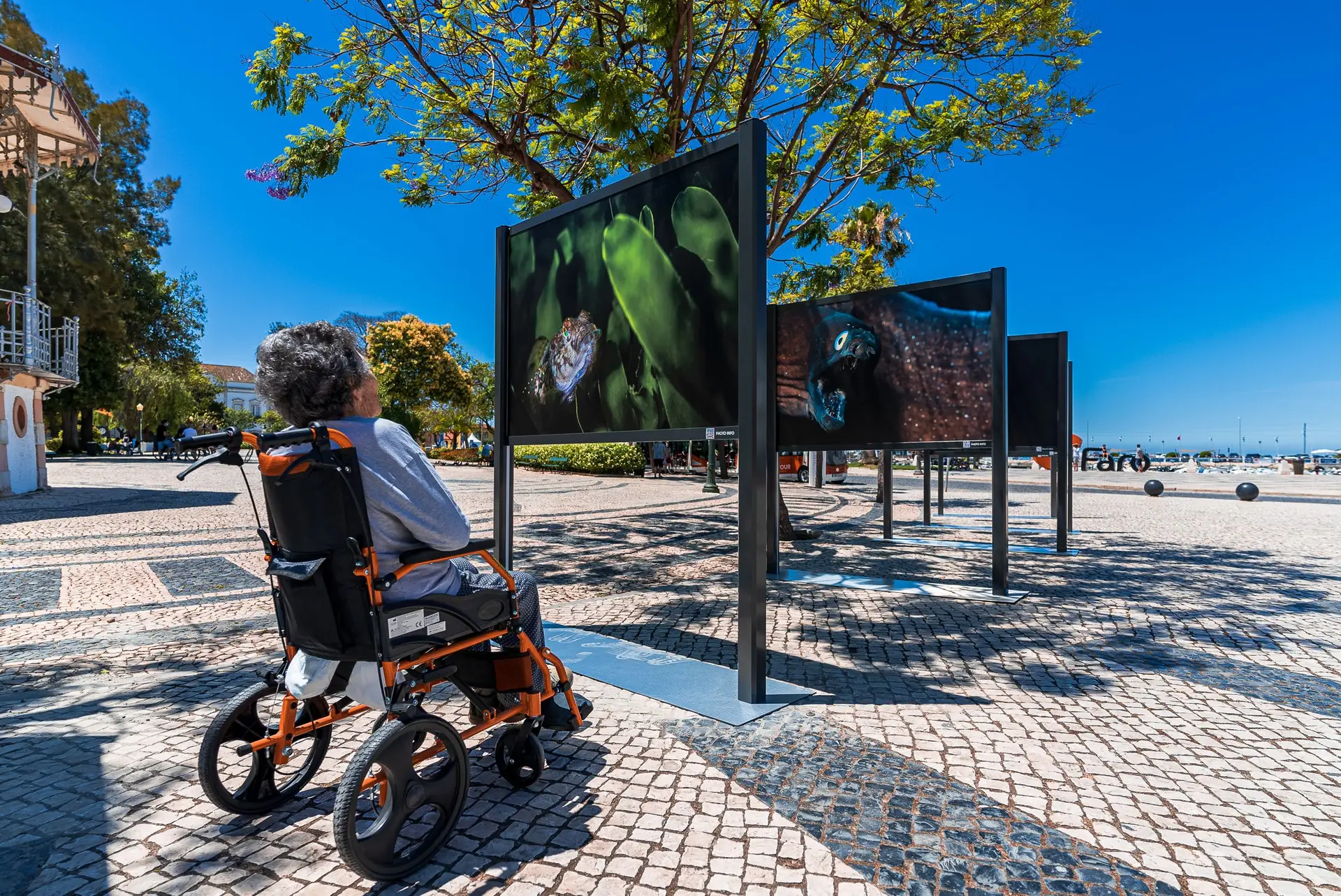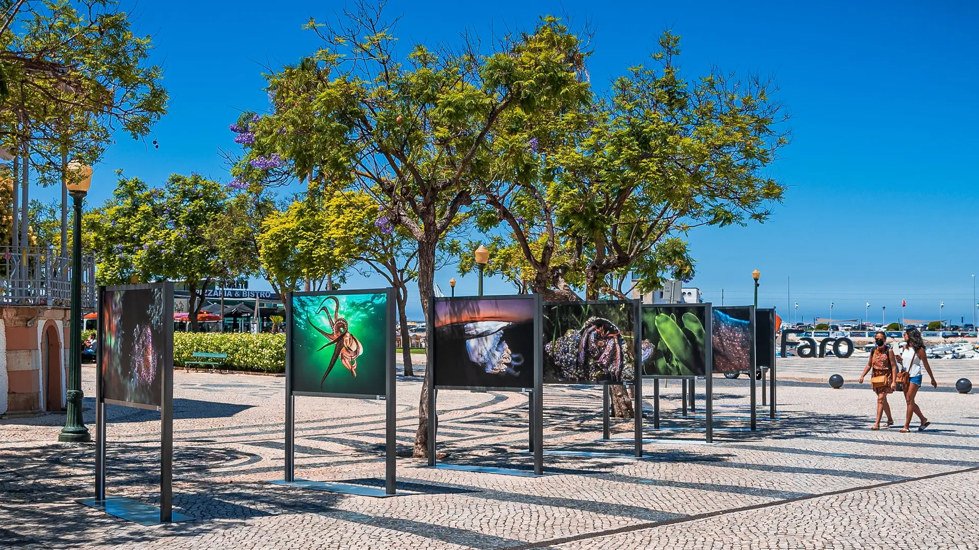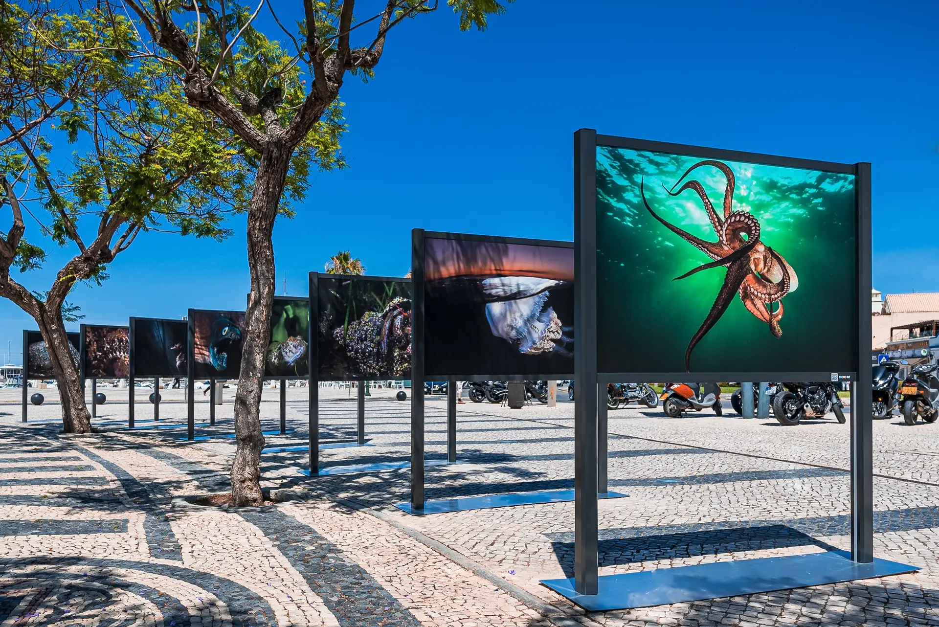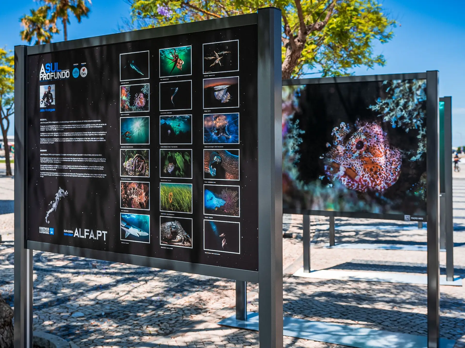 Todos estes seres subaquáticos da costa algarvia, estão expostos ao ar livre num conjunto de dez elegantes estruturas expositivas que albergam 18 fotografias, dispostas ao longo do jardim e acessíveis aos muitos populares que por lá passam e que agora têm um pretexto para parar e apreciar a fauna e flora que apesar de estar perto de nós, não conseguimos apreciar de forma tão próxima e intimista como agora.