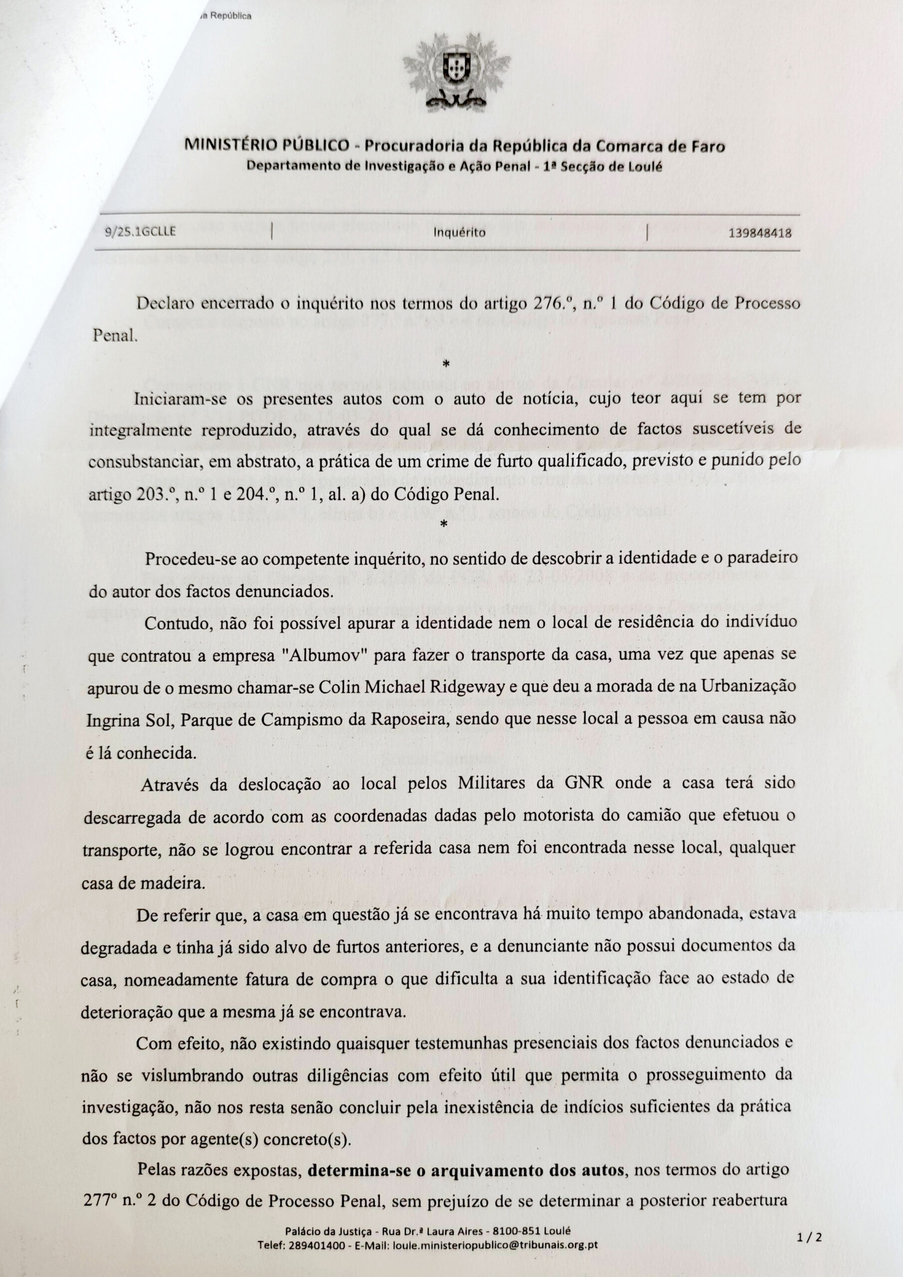 Segundo o despacho, “não foi possível apurar a identidade nem o local de residência do indivíduo que contratou a empresa ‘Albumov’ para fazer o transporte da casa”. O documento acrescenta que apenas se apurou que essa pessoa se identificava como Colin Michael Ridgeway e que indicou uma morada na Urbanização Ingrina Sol, Parque de Campismo da Raposeira, sendo que, de acordo com o Ministério Público, a pessoa em causa não é ali conhecida.