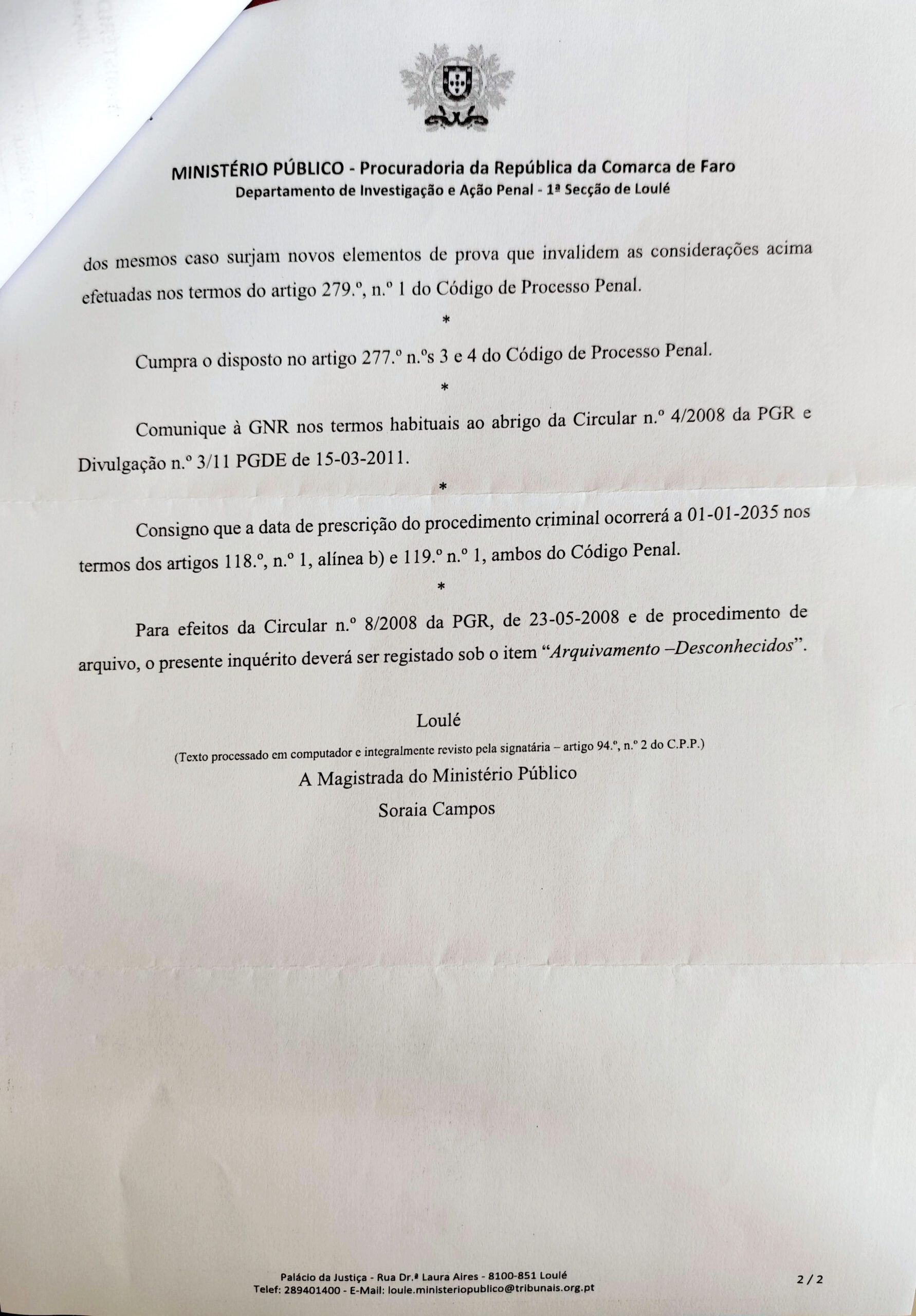 No documento, a magistrada refere que o processo teve origem num auto de notícia relativo a factos suscetíveis de integrar, em abstrato, a prática de um crime de furto qualificado. O inquérito procurou apurar a identidade e o paradeiro do autor dos factos denunciados, mas sem sucesso.