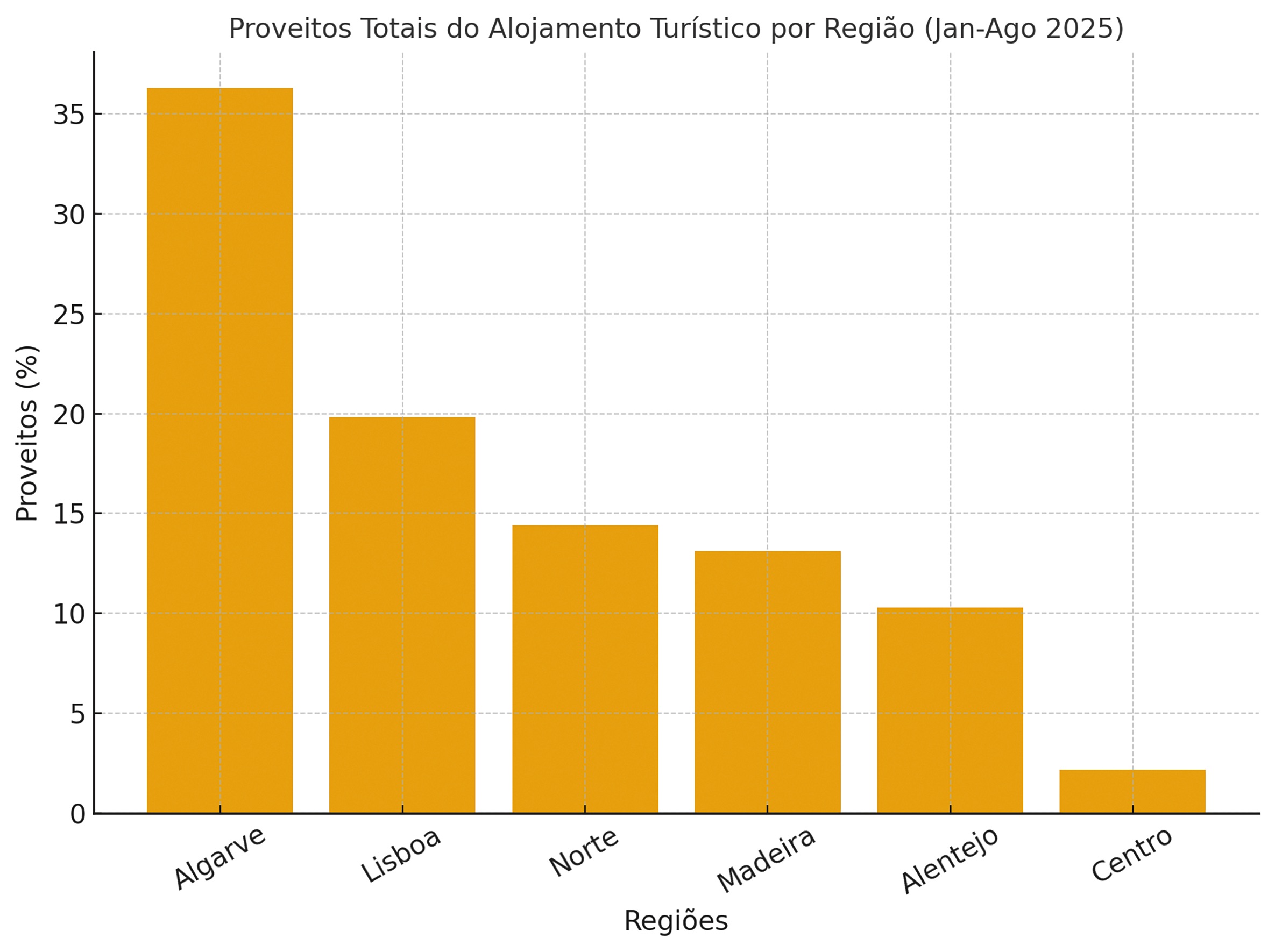 O Algarve destacou-se como a região mais relevante para o setor, concentrando 36,3% dos proveitos totais e 36,1% dos proveitos de aposento. Logo a seguir surgem a Grande Lisboa (19,8% e 20,2%) e o Norte (14,4% e 14,5%).