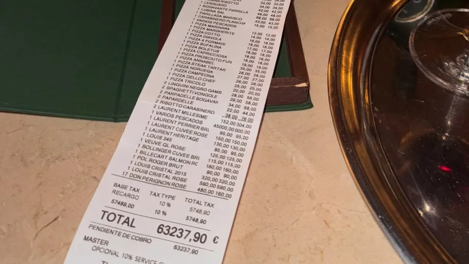 Um jantar em grupo terminou com uma fatura fora do comum em Espanha. No total, 18 pessoas sentaram-se à mesa, pediram vários pratos e vinhos, e acabaram por deixar no restaurante mais de 63.000 euros. A conta, que inclui também uma gorjeta próxima dos 6.000 euros, foi divulgada pelo próprio estabelecimento nas redes sociais. A publicação, acompanhada de uma fotografia do talão, gerou milhares de reações e levantou debate sobre a dimensão do consumo e a política de serviço do espaço.