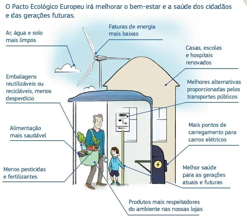 O Pacto Ecológico Europeu (PEE) é movido por um objetivo ambicioso e urgente: ser o primeiro Continente a atingir neutralidade climática, até 2050. Este Green Deal prevê 7 domínios de intervenção: Energia limpa, Indústria sustentável, Construção e renovação, Mobilidade sustentável, Biodiversidade, «Do prado ao prato», Eliminação da poluição. Para melhor compreender o que é este Pacto, para que serve e a quem serve, a CE disponibilizou fichas informativas temáticas.