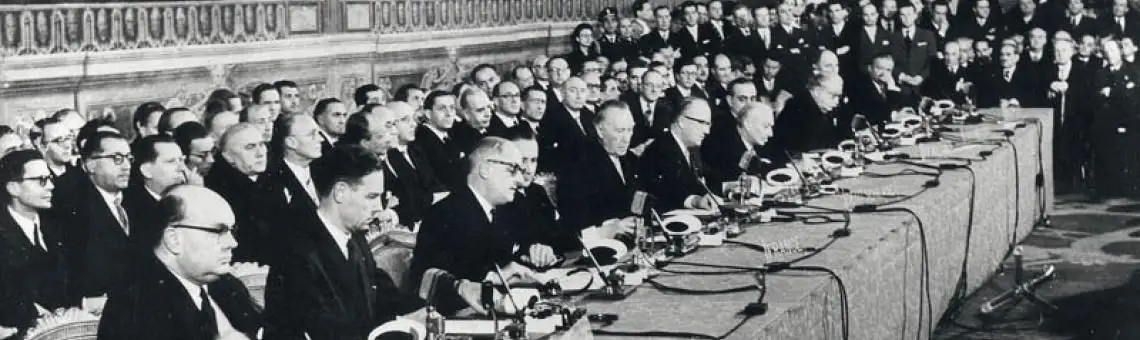 O Tratado de Roma foi assinado a 25 de março de 1957 pela Bélgica, Holanda, Luxemburgo, França, Itália e Alemanha, que instituía a Comunidade Económica Europeia (CEE) e a Comunidade Europeia da Energia Atómica (EURATOM), a primeira visando integrar a economia dos países membros com o estabelecimento da união aduaneira e de um mercado comum, e a segunda com o objetivo de fomentar a cooperação no desenvolvimento e utilização da energia nuclear e elevação do nível de vida dos países membros.