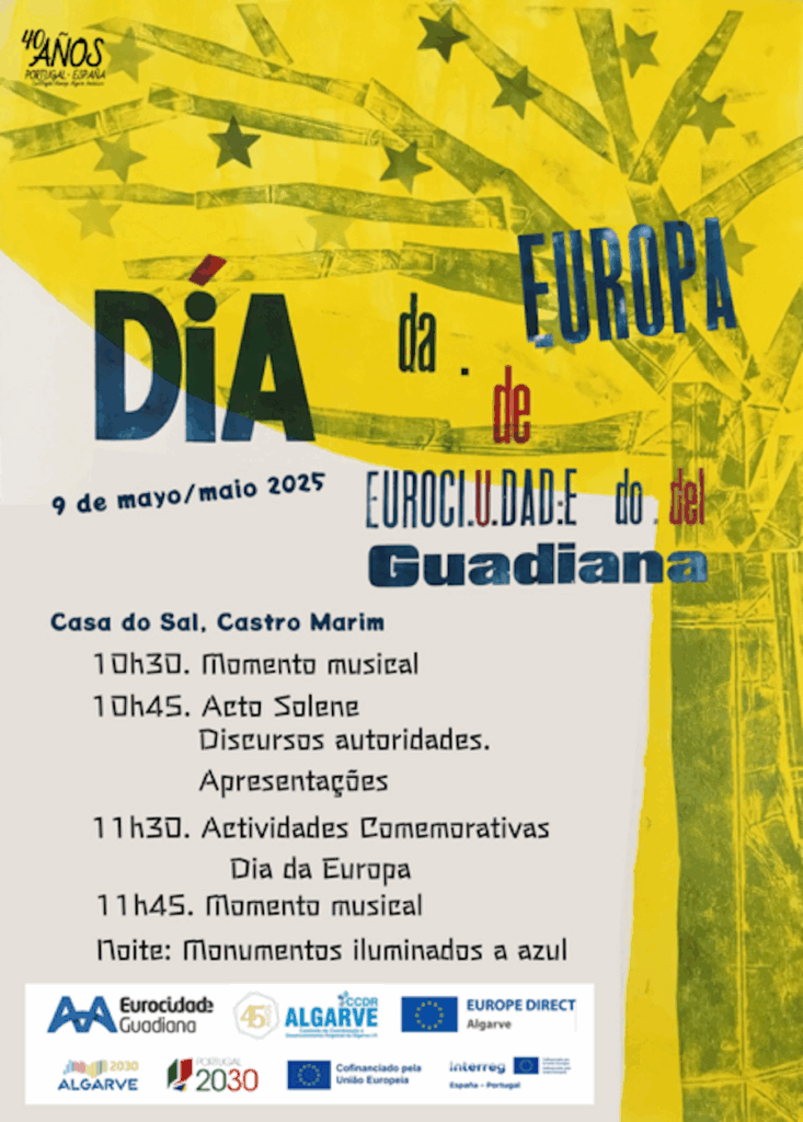 Atualmente, a União Europeia é composta por 27 Estados-Membros e continua a promover a integração, a democracia, a cooperação e os direitos fundamentais dos cidadãos europeus. No Algarve, as celebrações oficiais do Dia da Europa terão lugar na Casa do Sal, em Castro Marim, a partir das 10h30. A sessão contará com a interpretação do Hino da Europa e intervenções institucionais de várias entidades, incluindo a presidente da Câmara Municipal de Castro Marim, Filomena Pascoal Sintra, o vice-presidente da Eurocidade, Alberto Fernández, acompanhado pela equipa de La Escalera, representantes do Banco Europeu de Investimentos, o presidente da CCDR Algarve, José Apolinário, e o presidente da Assembleia Geral da Eurocidade do Guadiana, Álvaro Araújo. Será ainda apresentado o projeto transfronteiriço Paseo por el Arte 2026 e anunciada a candidatura da Eurocidade a Comunidade Europeia do Desporto 2026.