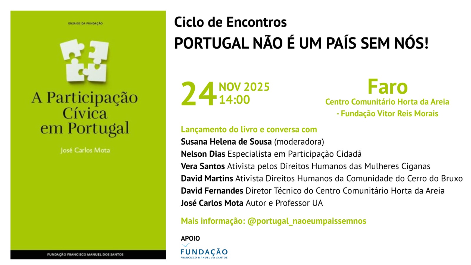 O Ensaio de José Carlos Mota, editado pela Fundação Francisco Manuel dos Santos será apresentado a partir das 14:00 com a participação do autor, de ativistas, de líderes comunitários e de especialistas em participação cívica. A moderação é de Susana Helena de Sousa do projeto MUROS.