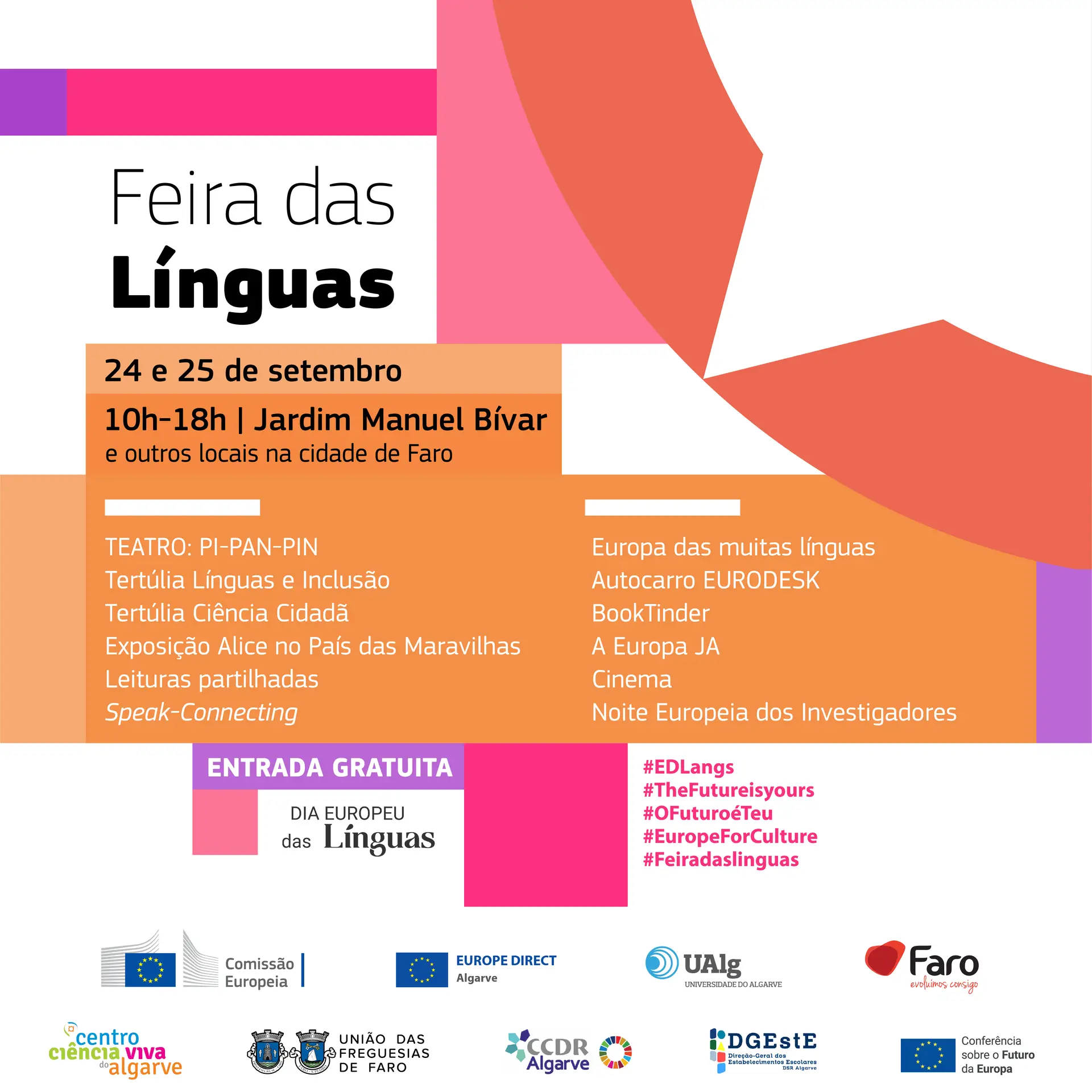 Assinala-se este ano em Portugal, a 24 e 25 de setembro, o Dia Europeu das Línguas, uma organização da Representação da Comissão Europeia em Portugal em colaboração com o Europe Direct Algarve e a Universidade do Algarve e ainda com o apoio da Direção-Geral dos Estabelecimentos Escolares (DGEstE), do Município de Faro, da União das Freguesias de Faro e da Comissão de Coordenação e Desenvolvimento Regional (CCDR) da Região do Algarve. Os alunos da Escola Secundária Pinheiro e Rosa, em Faro, vão assegurar e informação e animação no recinto.