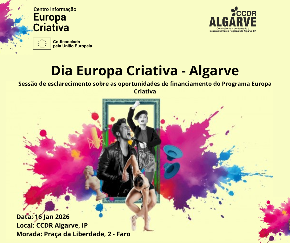 A CCDR Algarve promove, no próximo dia 16 de janeiro de 2026, em parceria com o Centro de Informação Europa Criativa (CIEC), um conjunto de sessões de esclarecimento dedicadas às oportunidades de financiamento do programa Europa Criativa.