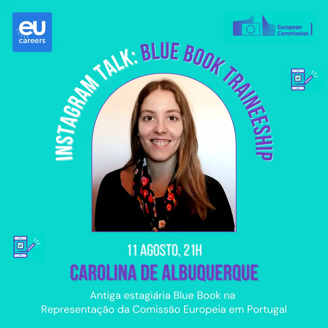 Conheces os Estágios Blue Book? Para promover as oportunidades de estágio na Comissão Europeia, a Representação da Comissão Europeia em Portugal organiza 3 IG TALKS durante o mês de agosto: 11, 18 e 25 de agosto às 21:00.