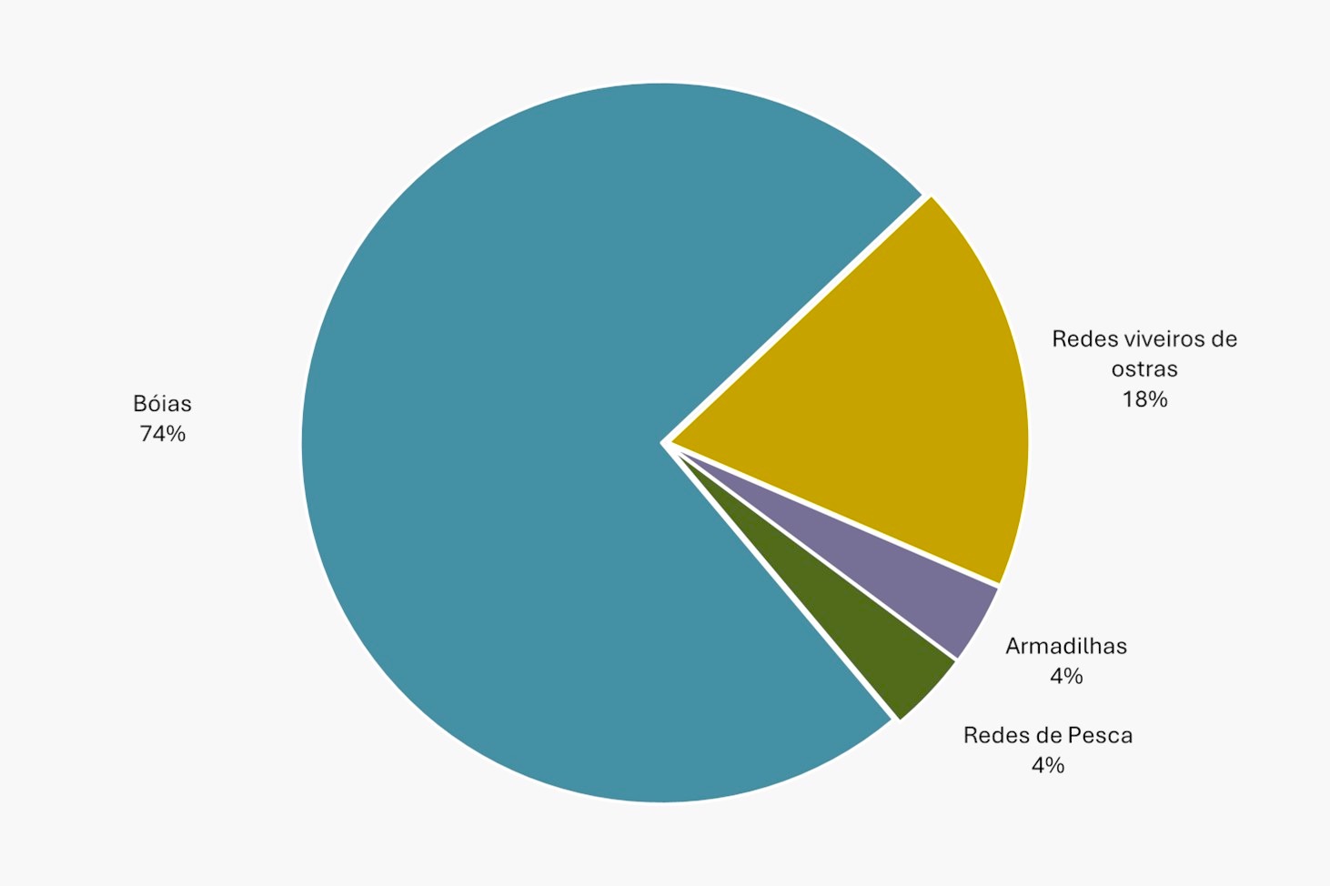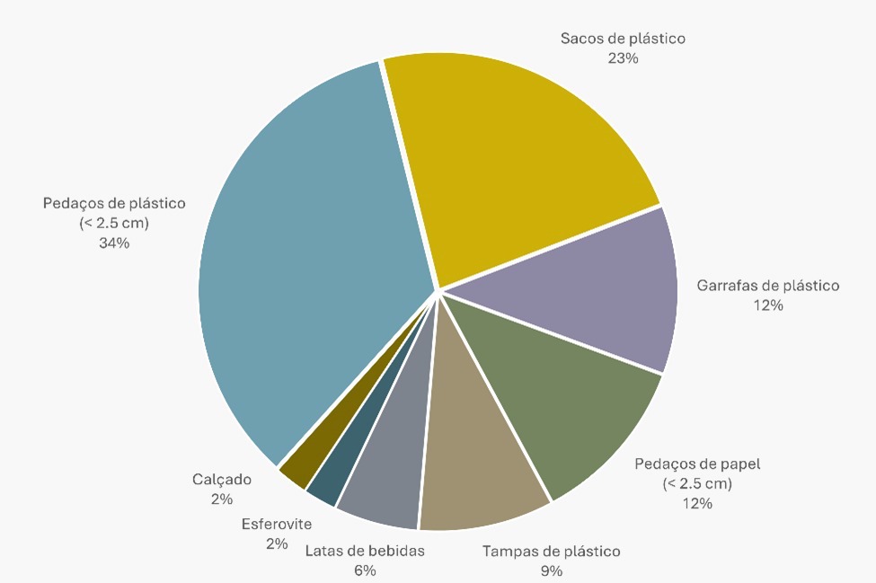 No âmbito deste trabalho foram recolhidos 400 L de lixo, estando os itens recolhidos detalhados nas Figuras 3 e 4. Para efeitos de inventariação o lixo foi dividido em duas categorias gerais “Itens Comuns” e “Material de Pesca”. Na categoria dos “Itens Comuns” (Figura 3), os recolhidos em maior número foram os itens de plástico, pela seguinte ordem, pedaços de plástico com tamanho inferior a 2,5 cm (34%), sacos de plástico (23%) e garrafas de plástico (12%). Na categoria “Material de Pesca” (Figura 4), os itens encontrados em maior número foram mini-bóias (74%), seguidos por redes de pesca (18%). É ainda de salientar que dentro desta categoria foram ainda recolhidos aproximadamente 65 metros de cordas, cabos e linhas de pesca.