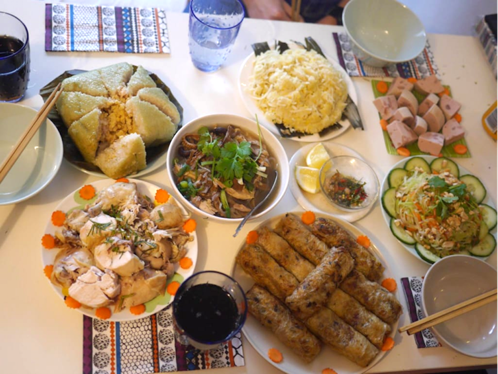 As casas são decoradas com flores de damasco amarelas ou flores de pêssego rosa. Os alimentos que são frequentemente consumidos incluem Bánh Chưng (bolo de arroz quadrado) e Bánh Tét (bolo de arroz cilíndrico). O Banh Chung, um bolinho de arroz quadrado recheado com arroz glutinoso, purê de feijão mungo e carne de porco temperada, é um prato imperdível durante o Tet. Também são consumidos pratos caramelizados com carne de porco, camarão ou frango. Frios deliciosos são essenciais na mesa do Tet: Gio thu (queijo), Gio bo (linguiça macia de carne bovina e endro) e Cha mo (patê de carne de porco e bacon cozido no vapor e frito até ficar crocante), além do Gio lua (linguiça macia tradicional). Todos esses itens podem ser encontrados em delicatessens vietnamitas. O Tet vietnamita também oferece uma deliciosa variedade de picles para degustar.