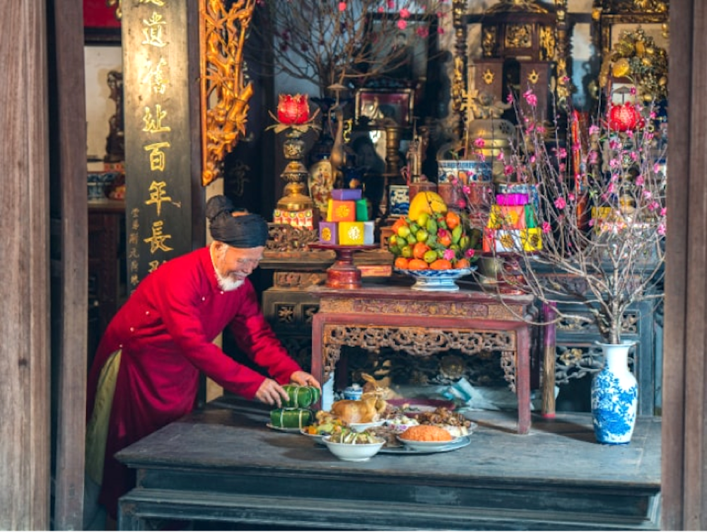 Além das delícias culinárias do Tet, o esplendor dos fogos de artifício asiáticos é imperdível tanto na China quanto no Vietnã, uma tradição verdadeiramente secular. Da varanda do Frasier Suites, é possível assistir aos fogos de artifício durante o Tet em toda a sua glória. Certas frutas são associadas à boa sorte, como o coco. Durante o Tet, é comum consumi-las em forma de bebida. As famílias vietnamitas compram flores de pêssego, kumquat e laranjeiras para decoração. As cores vermelha e amarela são consideradas de sorte e trazem prosperidade durante o Tet. É estritamente proibido, durante o Tet, que alguém que perdeu um amigo ou familiar visite outra pessoa (um tabu). Assim como na Europa, é proibido varrer a casa durante o Tet, pois varrer simboliza “varrer a sorte para longe”. O culto aos ancestrais é um costume muito importante para muitos vietnamitas. Bandejas com cinco frutas frescas são colocadas em altares dedicados aos ancestrais, e incenso é aceso em sua homenagem. O bolo Chung também é colocado no altar. No Tet, existe a tradição do “Xông đất”, ou seja, a primeira pessoa a entrar na casa no primeiro dia do ano novo. É ele quem decide a prosperidade da família durante o ano.