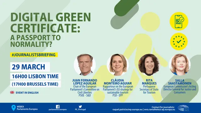 O Parlamento Europeu em Portugal organiza esta segunda-feira, 29 de março, às 16:00 (hora em Lisboa), um webinar para jornalistas sobre o Certificado Verde Digital. O tema foi debatido na sessão plenária do Parlamento Europeu, que aprovou o procedimento de urgência para aprovar o certificado até junho.
