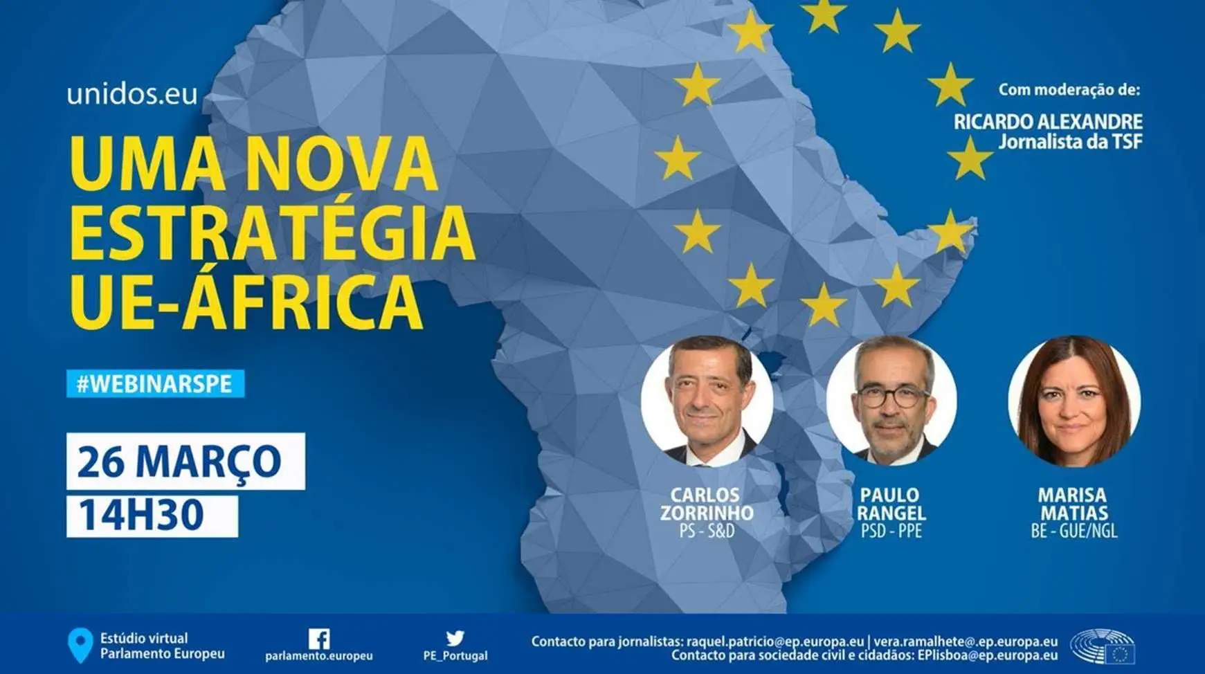 O evento surge no seguimento da adoção, pelo Parlamento Europeu, de uma estratégia abrangente sobre uma nova parceria UE-África, e conta com a participação dos eurodeputados Carlos Zorrinho (S&D, PS), Paulo Rangel (PPE, PSD) e Marisa Matias (GUE/NGL, BE). A moderação é feita por Ricardo Alexandre, jornalista da TSF.