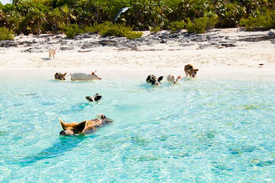 Neste destino remoto, situado nas Bahamas, existe um grupo de porcos que vive numa ilha completamente desabitada por humanos, denomidada de Ilha dos Porcos. A presença dos animais tornou-se tão marcante que o local é conhecido internacionalmente por esta comunidade suína, que nada ao lado de visitantes, sem qualquer sinal de medo ou desconforto.