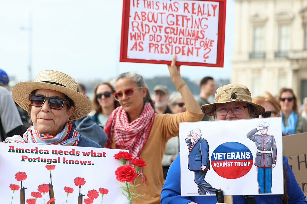 A mobilização foi convocada pela organização oficial do Partido Democrata no estrangeiro, Democrats Abroad (DA), associando-se a outros protestos noutras capitais europeias, que estão ligadas ao movimento contra Donald Trump ‘No Kings Day’, que se celebra hoje nos Estados Unidos.