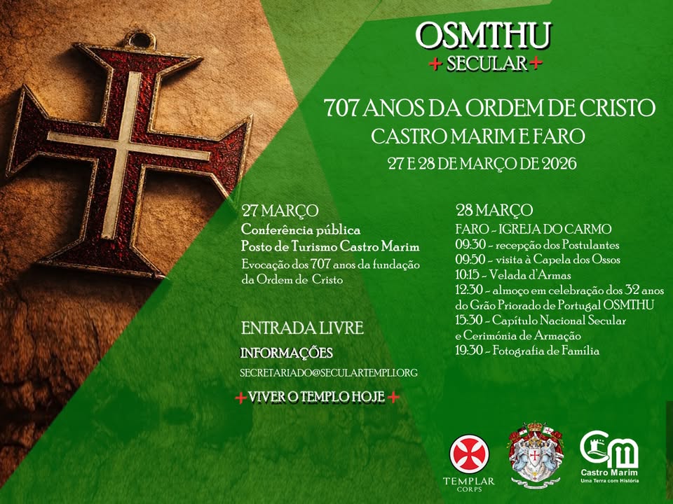 Castro Marim e Faro recebem, nos dias 27 e 28 de março, um conjunto de iniciativas evocativas dos 707 anos da fundação da Ordem de Cristo, promovidas pela Ordem do Templo Secular (OSMTHU).
