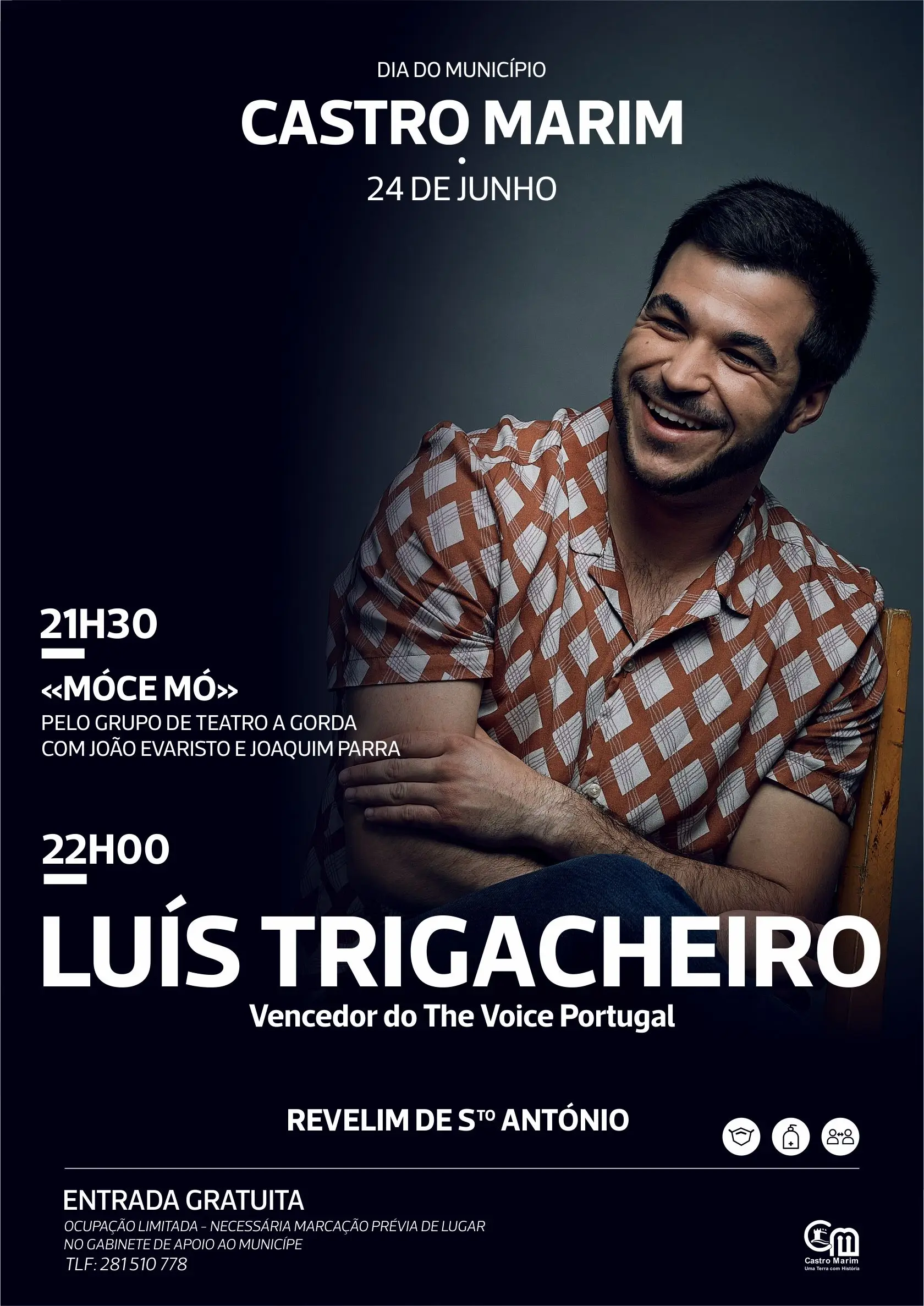 À noite as celebrações continuam, este ano já abertas à comunidade, pese embora com as limitações inerentes ao controlo da pandemia Covid-19. O Revelim de Santo António, palco cultural por excelência, acolhe, pelas 21:30, o espetáculo de teatro “Móce mó”, pelo Grupo de Teatro “A Gorda”, com João Evaristo e Joaquim Parra. Segue-se, às 22:00, o concerto de Luís Trigacheiro, vencedor do The Voice Portugal.