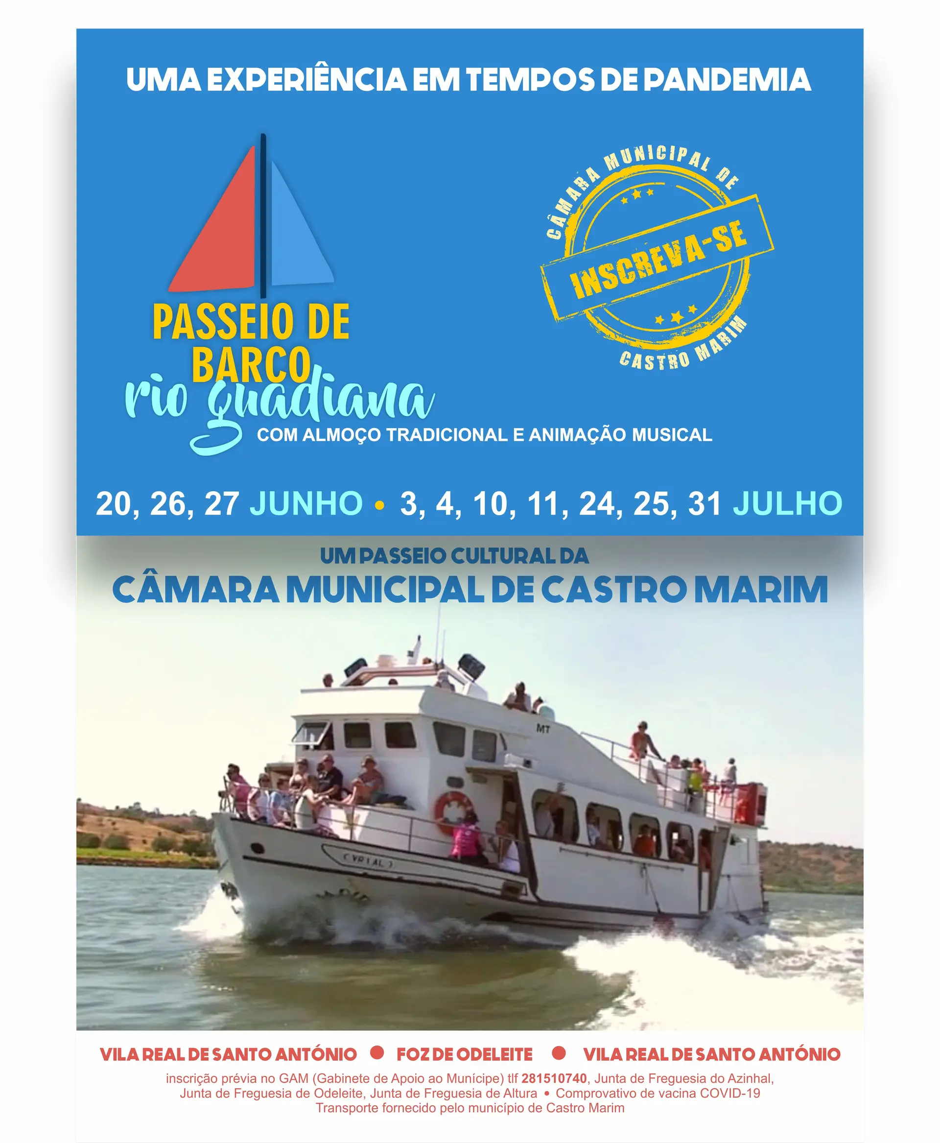 Tendo isto em mente, e com uma realidade demográfica envelhecida, sobretudo no interior do concelho, o Município de Castro Marim decidiu promover uma experiência destinada, preferencialmente, aos munícipes que já estejam protegidos. Trata-se de um passeio de barco pelo Rio Guadiana, com almoço tradicional e animação musical, desde Vila Real de St. António até à Foz de Odeleite.
