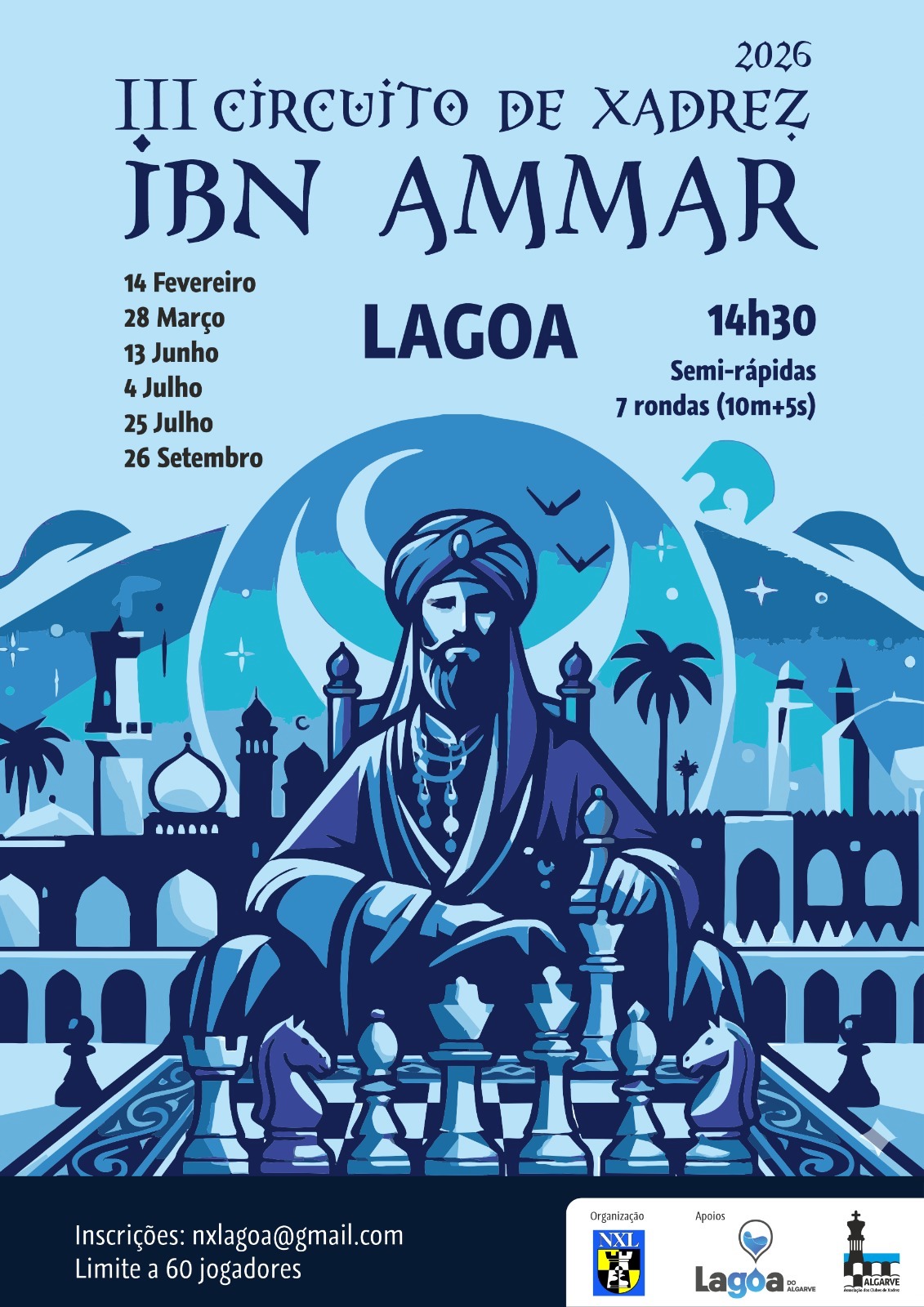 O Núcleo de Xadrez de Lagoa vai organizar, ao longo de 2026, um circuito de xadrez dirigido a jogadores federados, com provas homologadas para efeitos de ranking internacional. A iniciativa conta com o apoio da Câmara Municipal de Lagoa e da ACXA – Associação dos Clubes de Xadrez do Algarve, estando a direção e a arbitragem a cargo do clube organizador.