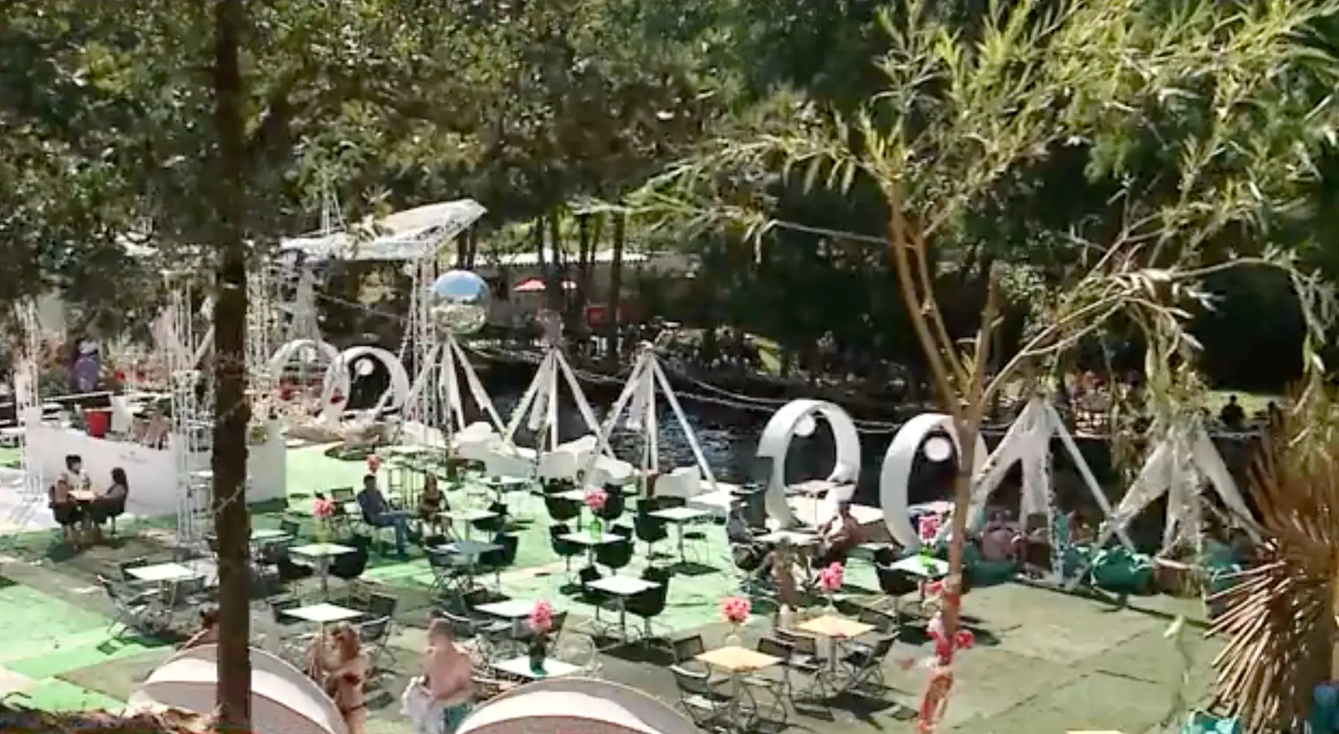 Quem aqui chega encontra uma decoração arrojada a lembrar uma discoteca ao ar livre.