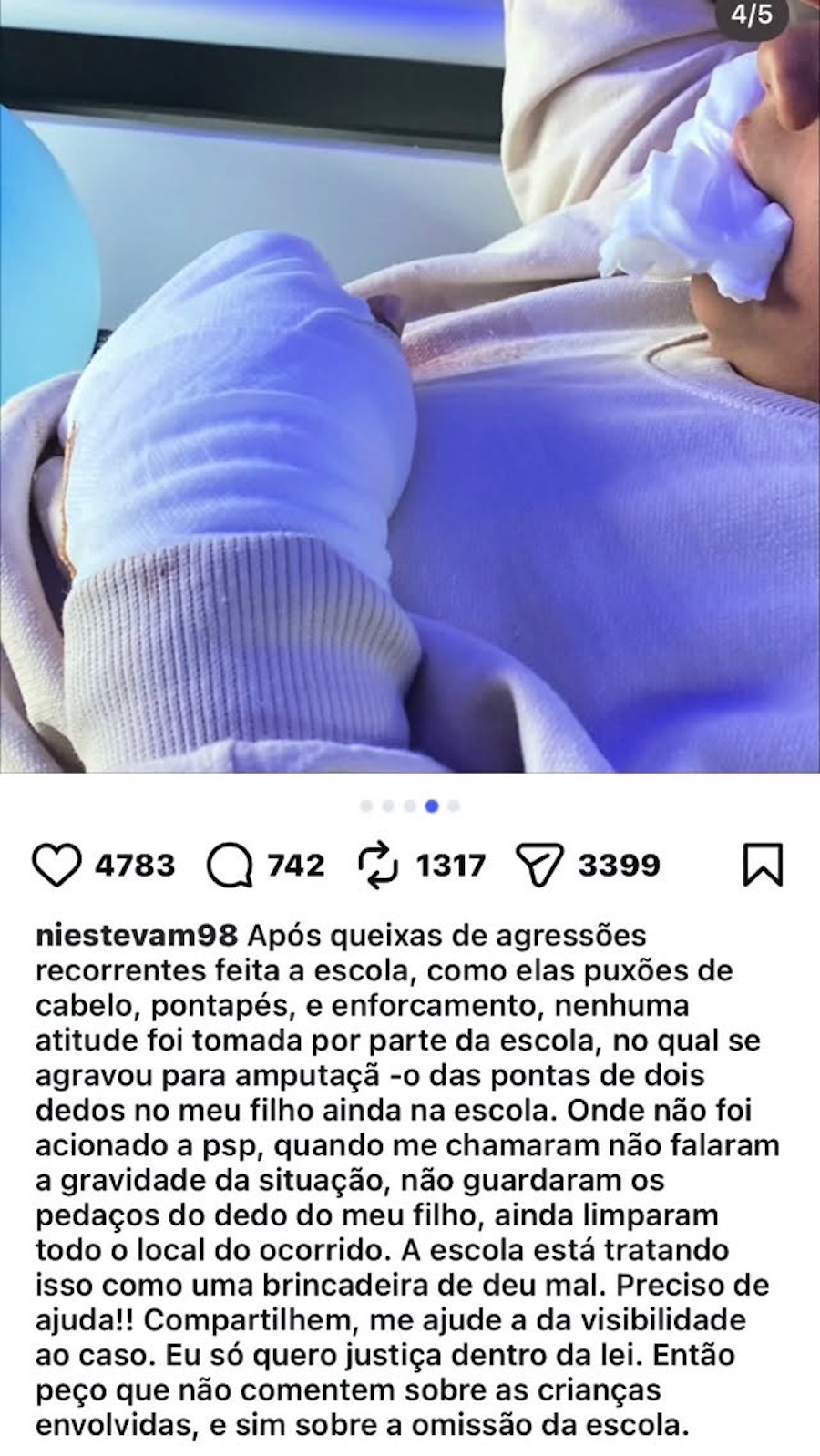 “Duas crianças fecharam a porta nos dedos do meu filho” quando ele foi à casa de banho, impedindo-o “de sair e pedir ajuda”, contou Nivia Estevam numa das publicações, acrescentando que o menino “perdeu muito sangue e precisou de se arrastar por baixo da porta com os dedos já amputados”.